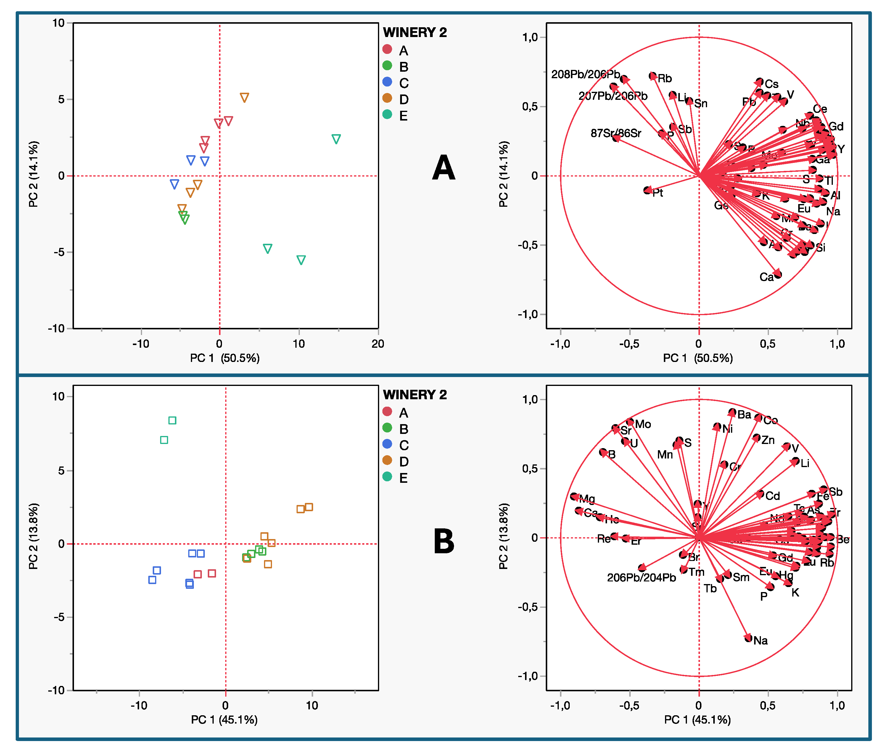 - Rapa, M.; Ferrante, M.; Rodushkin, I.; Paulukat, C.; Conti, M.E. Venetian Protected Designation of Origin Wines Traceability: Multi-Elemental, Isotopes and Chemometric Analysis. Food Chem. 2023, 404, 134771. [Google Scholar] [CrossRef]