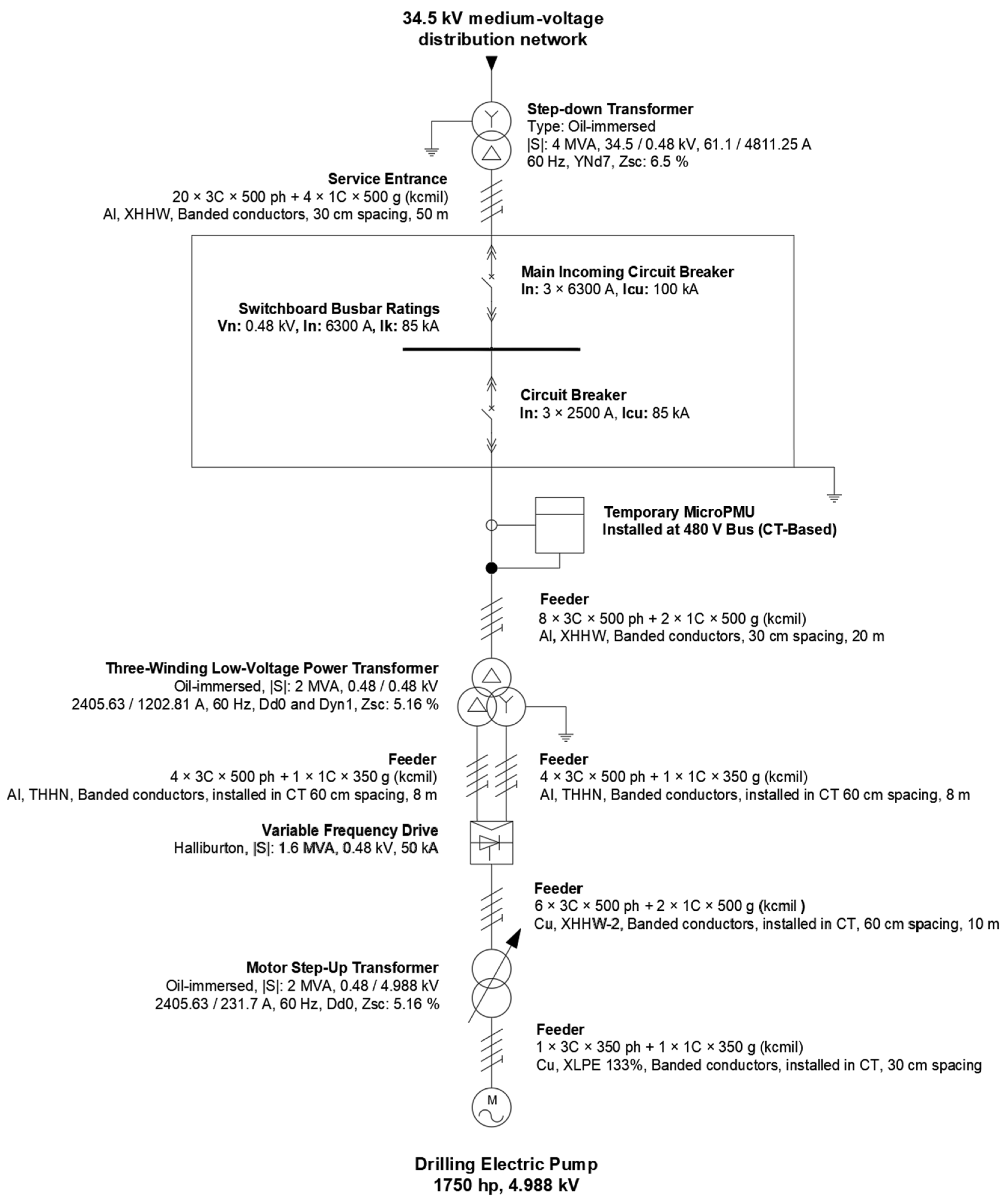 Data acquisition was performed using a microPMU phasor measurement unit (PQube 3, Powerside®, Alameda, CA, USA) installed on the 480 V low-voltage panel of a three-phase busbar with a capacity of 6300 A and a maximum short-circuit current of 85 kA in an industrial electrical system associated with an oil extraction facility, as shown in