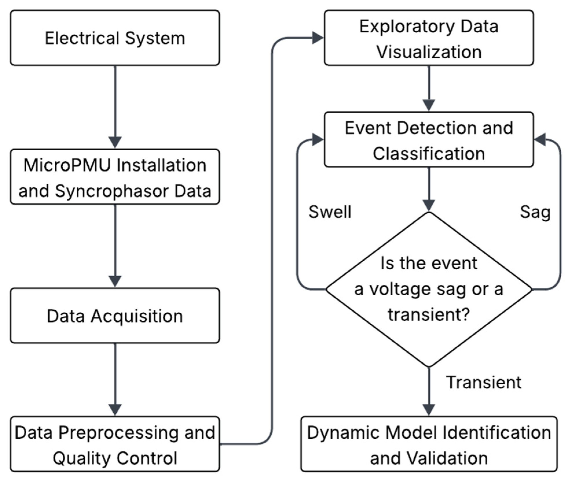 Figure 2. The process begins with the acquisition of high-resolution synchrophasor measurements at a representative point in the industrial power grid, followed by a preprocessing stage aimed at ensuring temporal consistency, record cleansing, and consistency of the measured signals. Based on this processed data, relevant transient events are identified and selected through systematic analysis of the signals, prioritizing those that exhibit dynamic oscillatory behavior. Once the event of interest has been selected using graphical methods, a local dynamic model is formulated using state-space identification techniques under an output-only approach, using only the measured variables. Finally, the identified model is subjected to statistical and modal validation processes in order to evaluate its consistency, robustness, and ability to reproduce the observed dynamics, thus closing a methodological flow oriented towards dynamic characterization based on real field data.