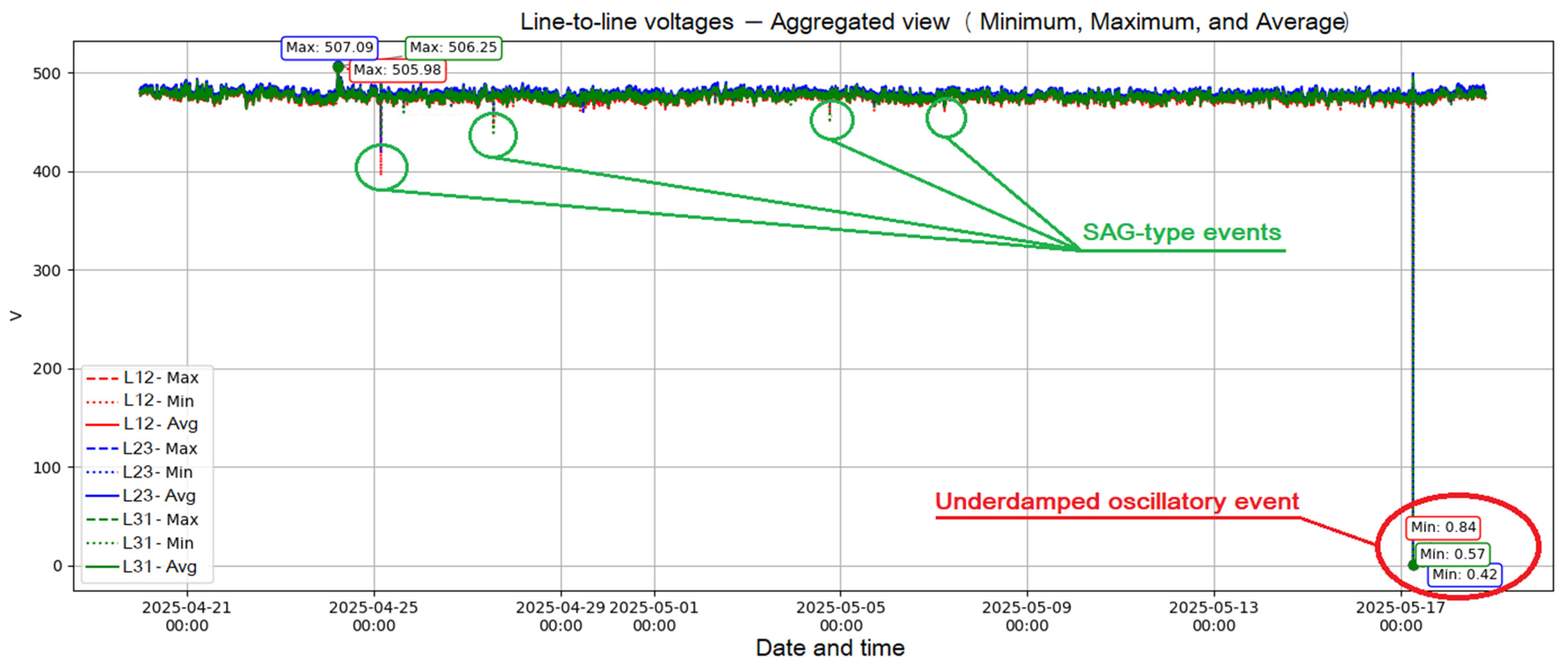 Since the microPMU stores measurements with a sampling frequency of 120 Hz, transient events were detected visually and systematically, as this type of event was not detected or highlighted by the equipment due to the characteristics of the event. The line voltages corresponding to the acquisition period (April–May 2025) are plotted, observing the behavior of the minimum, maximum, and average magnitudes over time using Python (Google Colab Environment).