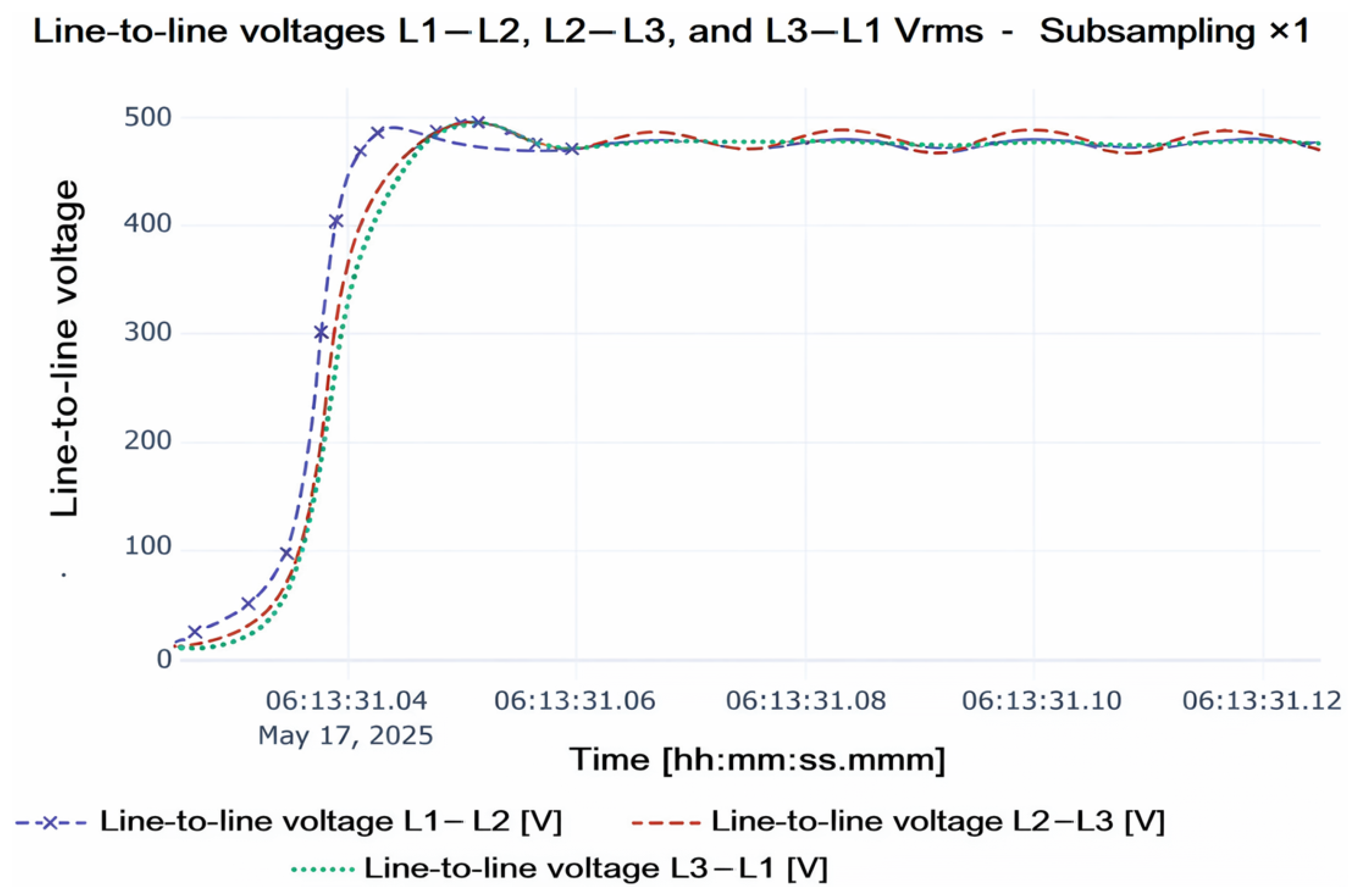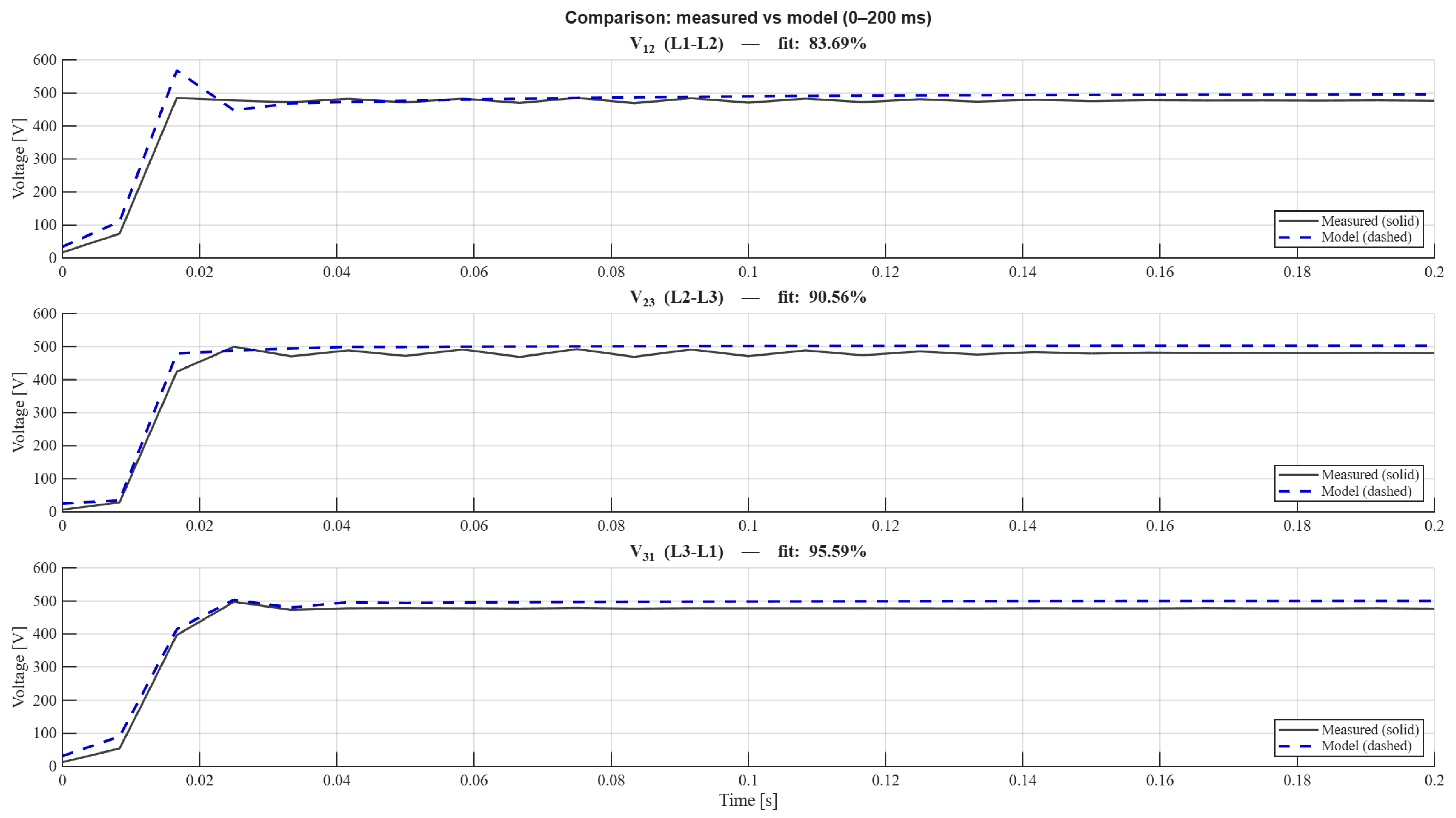 Figure 4 enlarges the time interval of the underdamped event, showing in greater detail the temporal variation of the three line-to-line voltages and the ripple that characterizes the transient. These results constitute the experimental basis on which the time-domain identification techniques were applied.