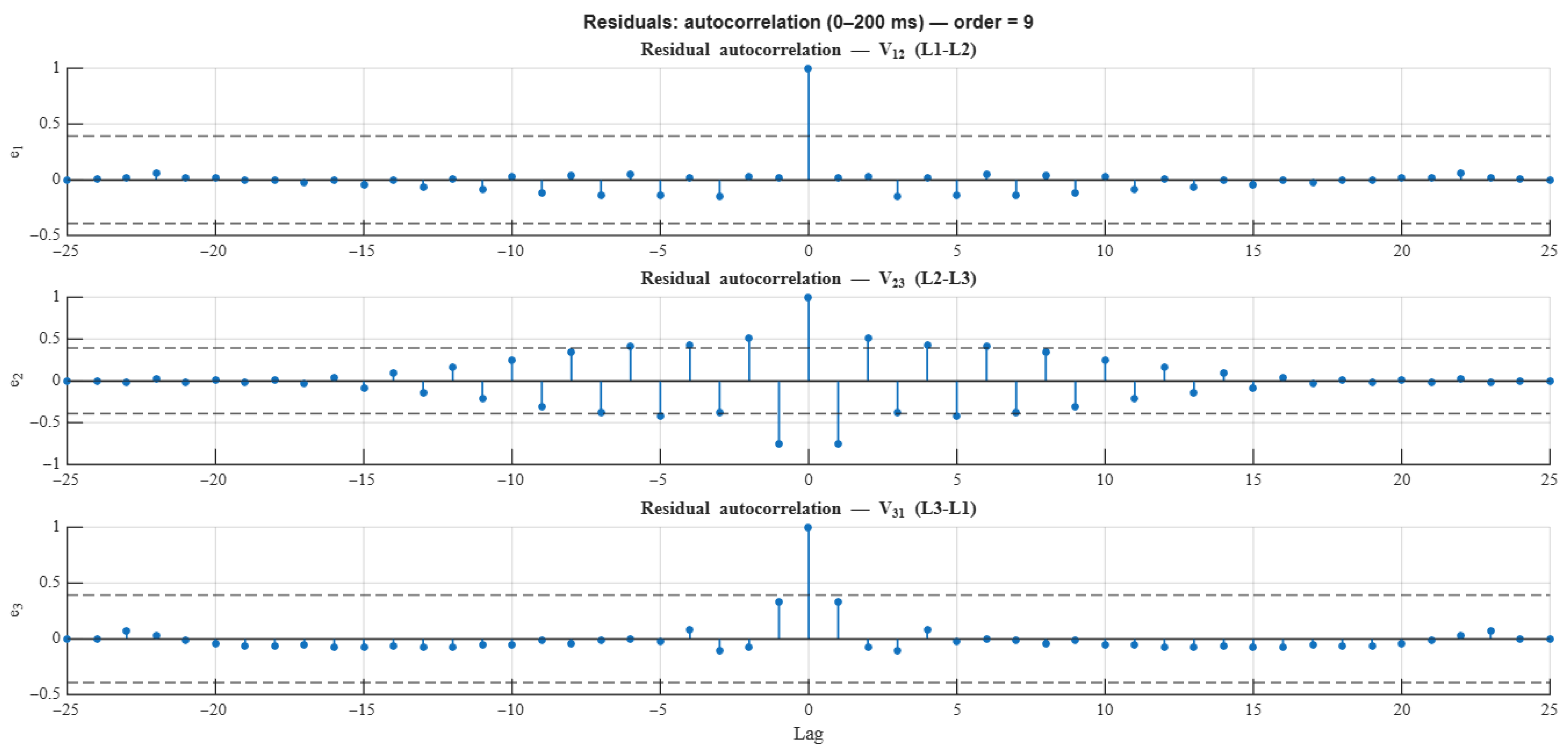 In order to verify that the model structure does not leave any relevant dynamics uncaptured, the autocorrelation of the residuals was analyzed in the same 0–200 ms interval.
