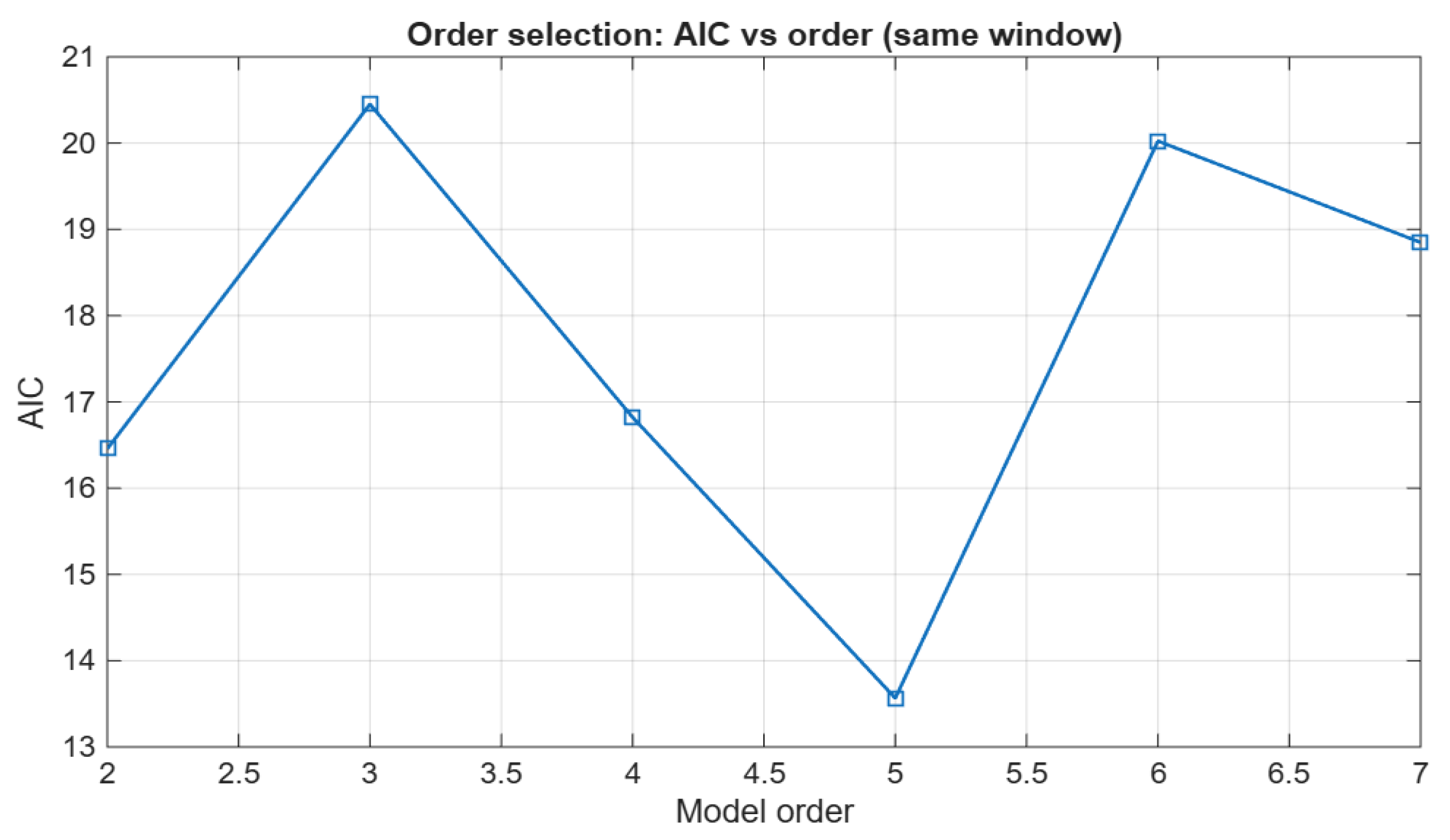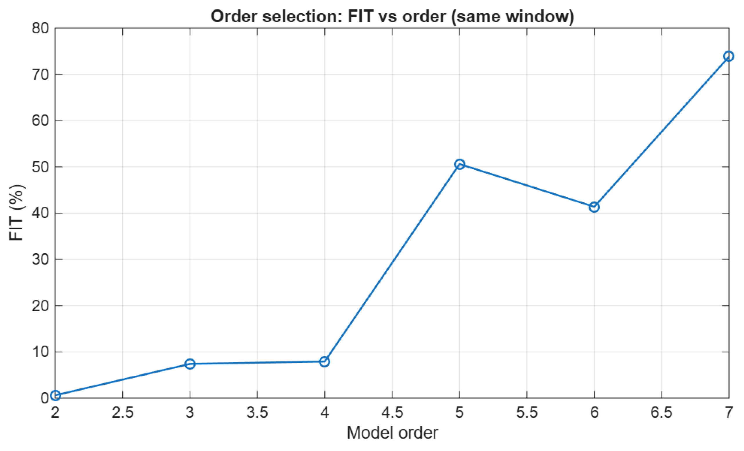 The results obtained for different system orders were compared, observing the evolution of the fit (expressed as a percentage) and the AIC criterion. The final order was selected based on the convergence of both indicators, ensuring that the model was parsimonious and numerically stable.