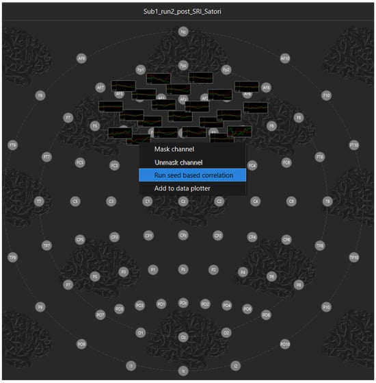 The materials and methods pertaining to the study are described in a previously published manuscript [36]. With specific reference to seed-based analysis, the study followed fNIRS guidelines for conducting resting state functional connectivity analysis, using Satori fNIRS (NIRX Software, Version 1.8.2, Brain Innovation, BV, the Netherlands). As such, seed-based correlations were calculated for each run/subject based on seed “S3-D2.” Seed-based correlation was performed by computing the temporal correlation between the a priori seed (S3-D2) and the rest of the channels. This procedure was performed for all participants, inclusive of the experimental and control groups. An example of a corresponding seed correlation of subject 1 is illustrated in Figure 1. An example of a seed-based map for all experimental subjects at pre-intervention is illustrated in Figure 2. Based on a priori evidence indicating the plasticity of the left dorsolateral prefrontal cortex (L-DLPF) in HIV cognitive rehabilitation [20,37,38], this seed was selected as the seed region for the cross-correlation. For the fNIRS analysis, this seed, (channel 6; x = −31; y = 39; z = 4l; Supplementary Materials Figure S1 and Table S1) indicated a specificity of 92%, as determined by fOLD [39].