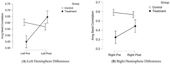 Average seed-correlation differences between groups by hemispheres were calculated by controlling for pretest scores using Analysis of Covariance (ANCOVAs) (Supplementary Materials Figure S2B,C). The treatment group showed significantly greater connectivity in the left hemisphere (difference = 0.1; 95% CI (0.57, 0.64); F (1, 17) = 37.98; p = 0.0001, d = 0.7), compared to the control group, post-brain training. There were no significant differences between groups on right hemisphere connectivity. Figure 5 summarizes group differences by hemisphere, emphasizing greater FC in the left hemisphere of participants in the treatment group post-brain training (M = 0.64; SD = 0.26), compared to baseline (M = 0.44; SD = 0.24).