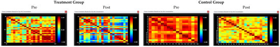 In the second research question, the study investigated whether the treatment group would indicate greater functional connectivity in either hemisphere (right or left) due to brain training. Figure 3 indicates average seed correlation differences within the treatment group pre- and post-training (Supplementary Materials Table S2D for average seed correlations). Figure 4 indicates average seed correlation differences within the control group, pre- and post-training (mean average scores for seed correlations are noted in Supplementary Materials Table S2D).