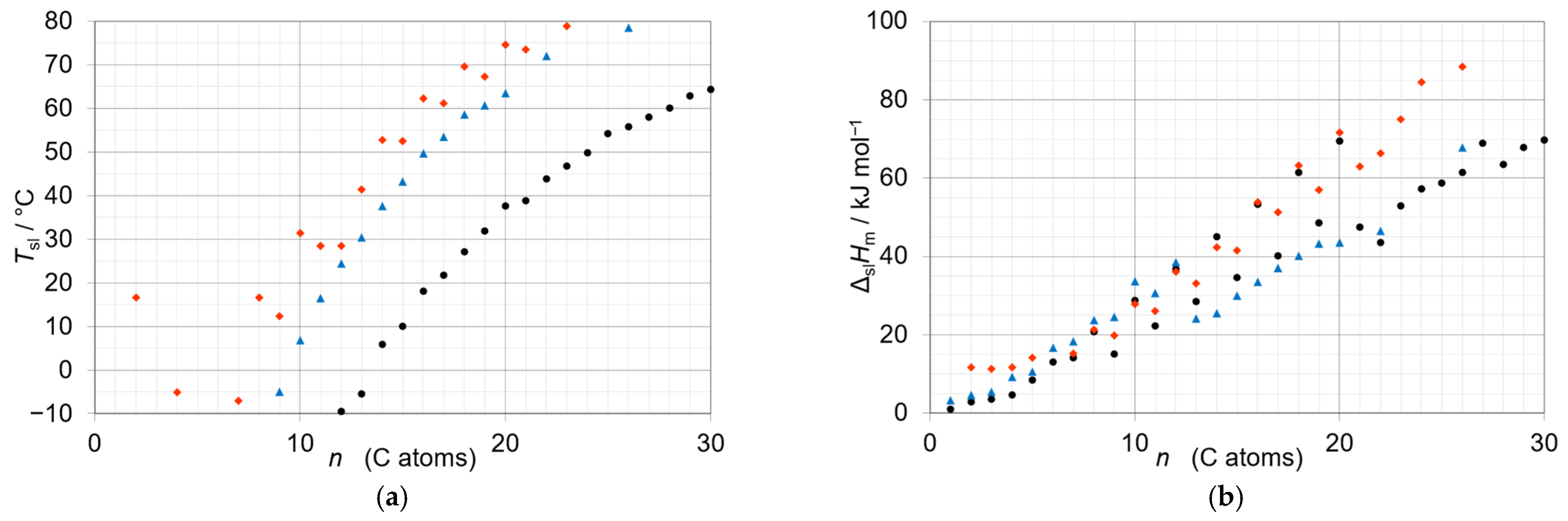 - Mehling, H.; White, M.A. Analysis of trends in phase change enthalpy, entropy and temperature for alkanes, alcohols and fatty acids. Chem. Phys. Impact 2023, 6, 100222. [Google Scholar] [CrossRef]