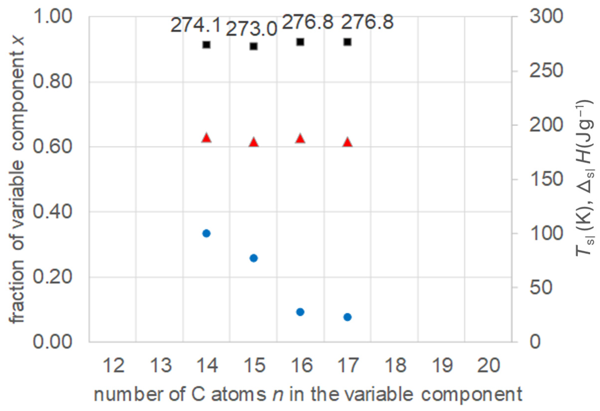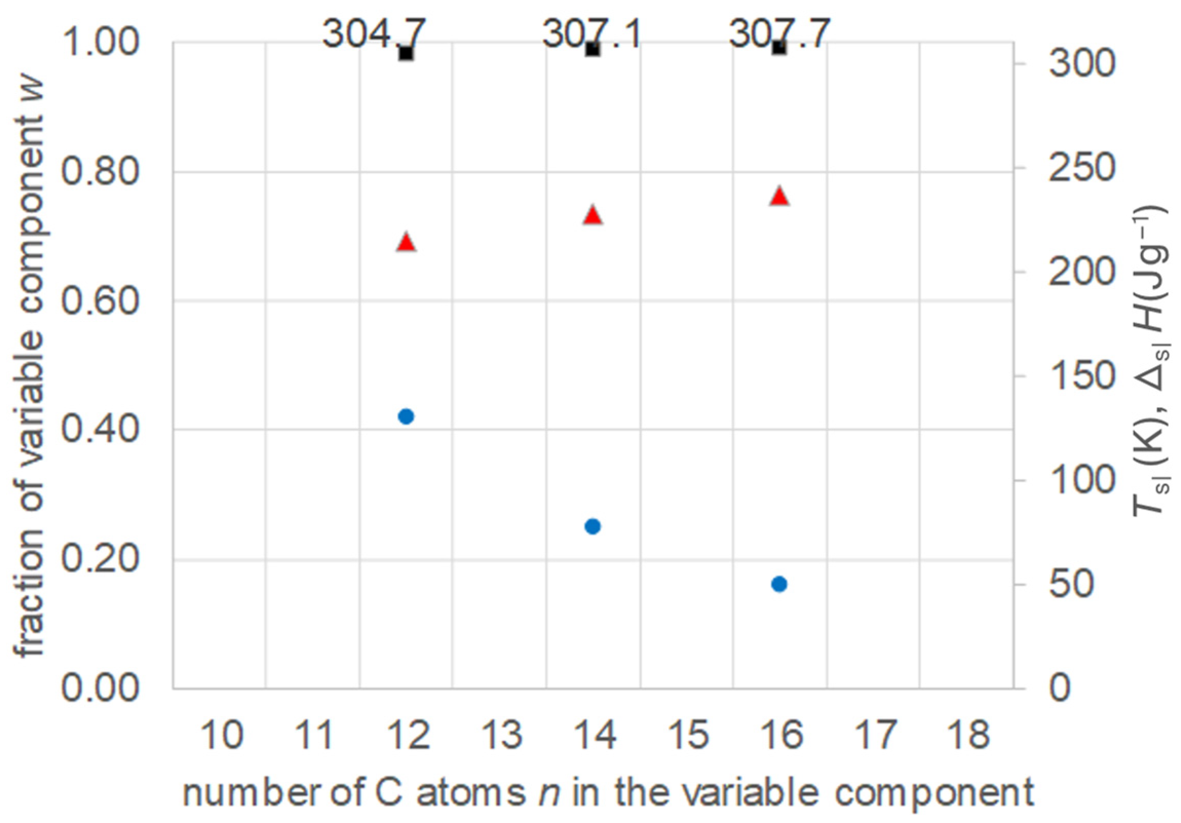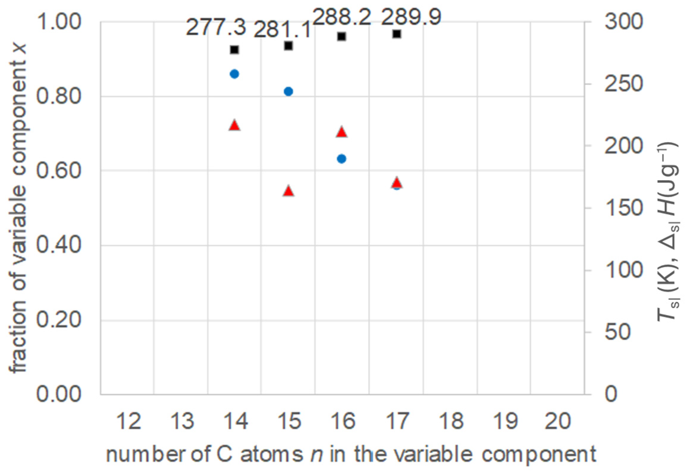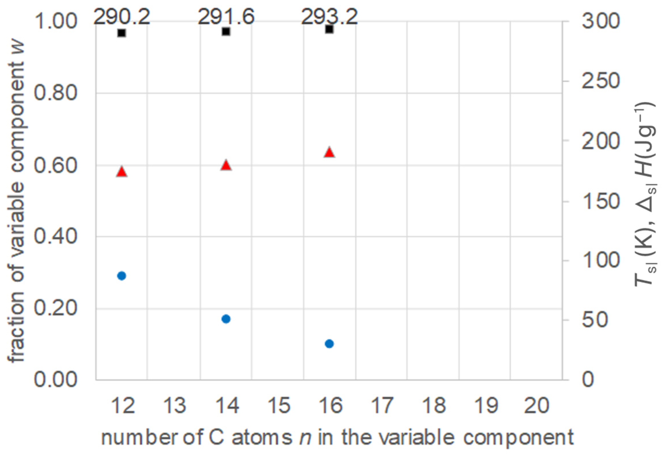 - Regarding PCM development, a systematic trend in Tsl and in the fraction w or x of eutectics (Figure 14) allows us to predict probable Tsl and w or x of new eutectics from a few known ones. For example, knowing Tsl for mixtures of n-alkane n = 14 with n = 17, 19, and 21 (Figure 6), it is likely that mixtures with other odd n outside that n range have higher Tsl for higher n, and lower Tsl for lower n, or to fill gaps with regard to n. This can be performed as well by theoretical models. Theoretical models work for any mixture, can even predict what can be mixed, the phase diagram which allows to assess the phase change behavior, even if a eutectic exists at all. However, specifically regarding Tsl, the trends seem to be more precise than some models. Even more, theoretical models require at least knowledge of Tsl and ΔslH of the components, thus literature data or own measurements. However, if a component decomposes before melting, these data cannot be determined at all.