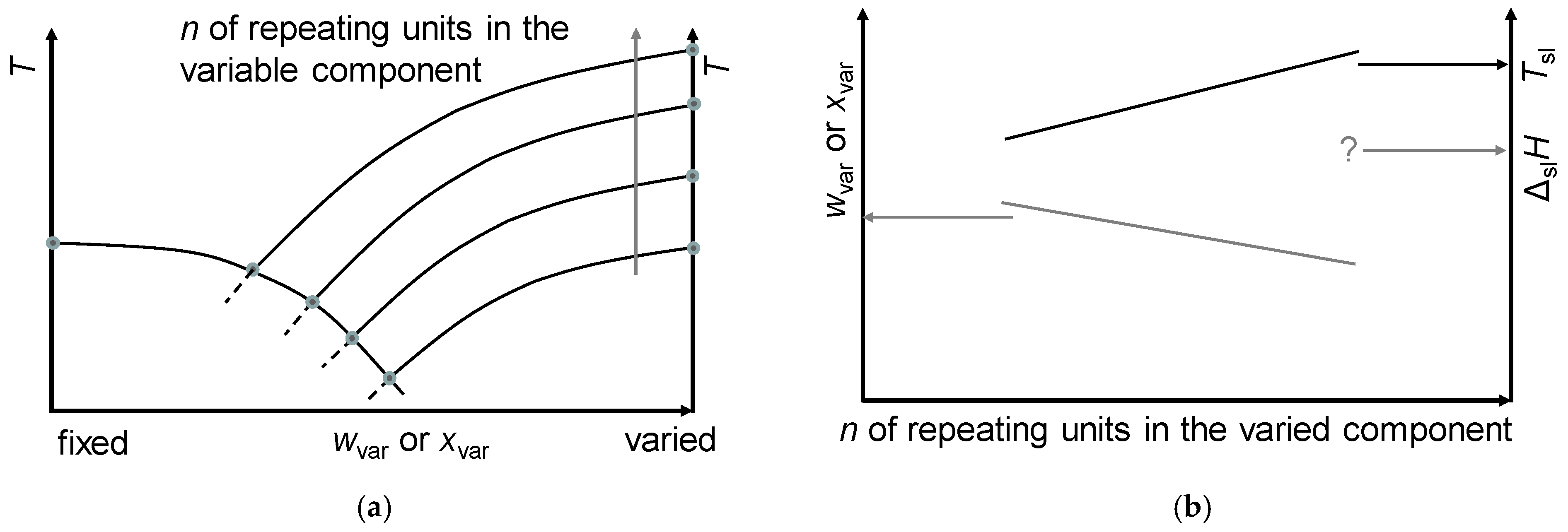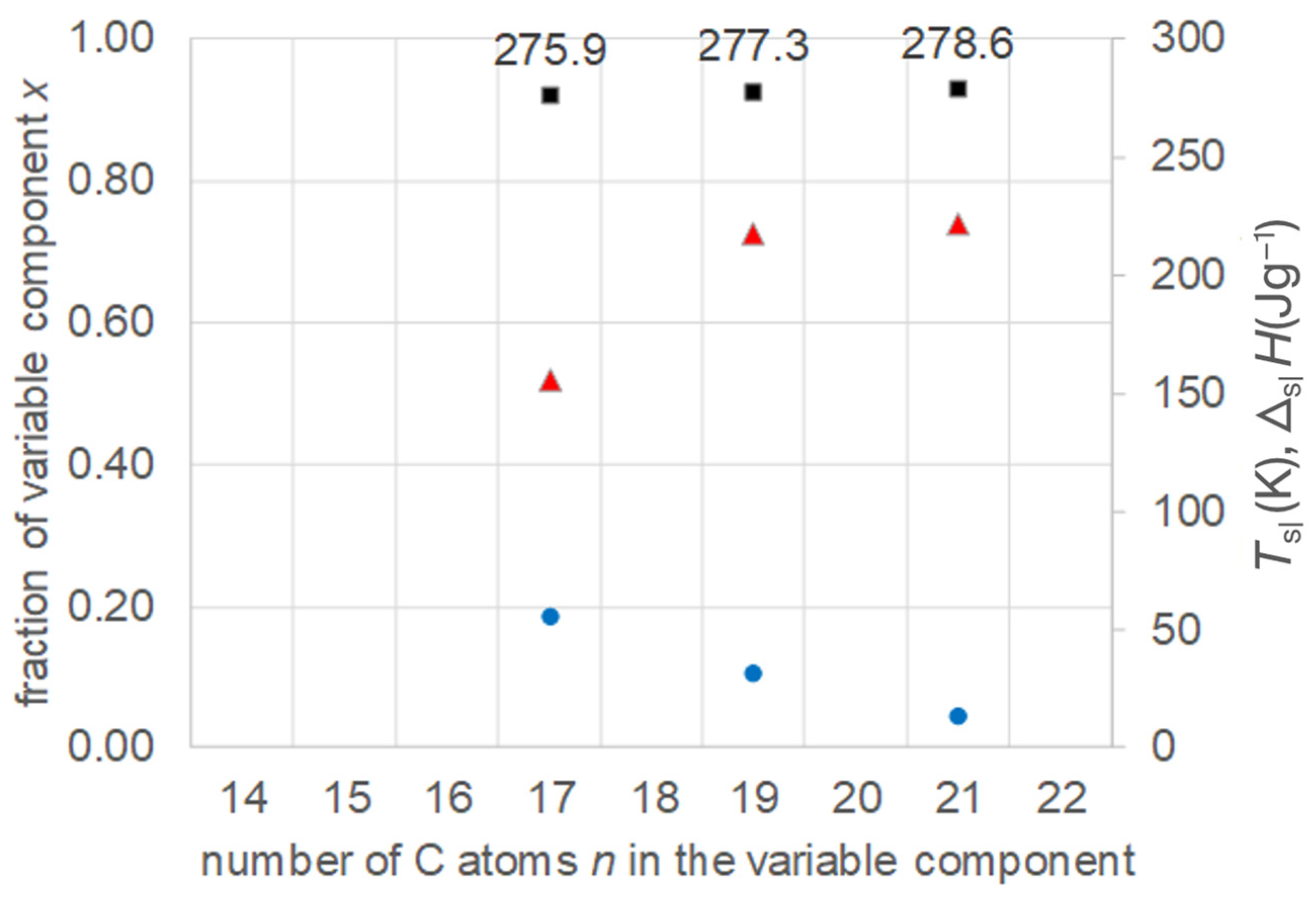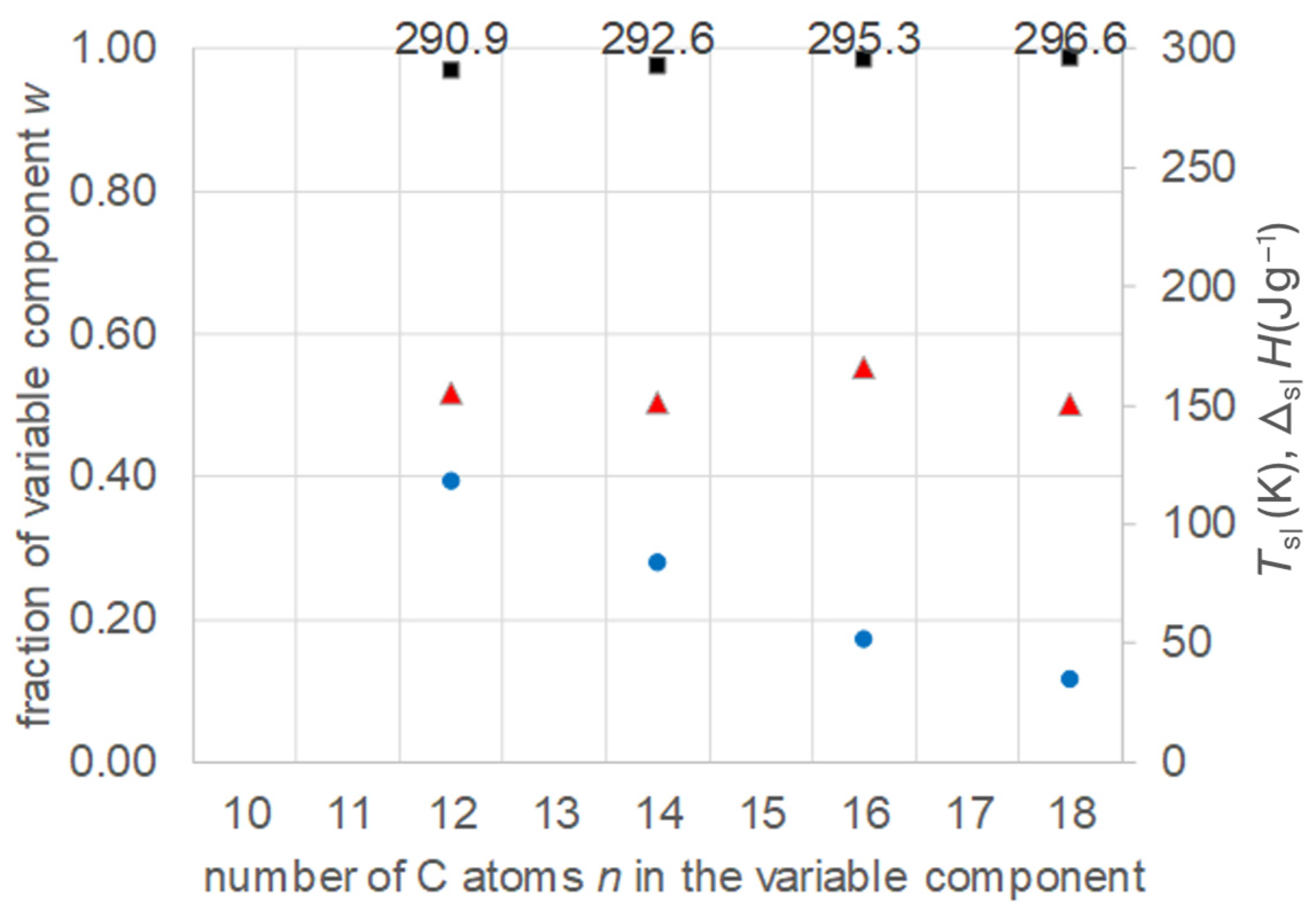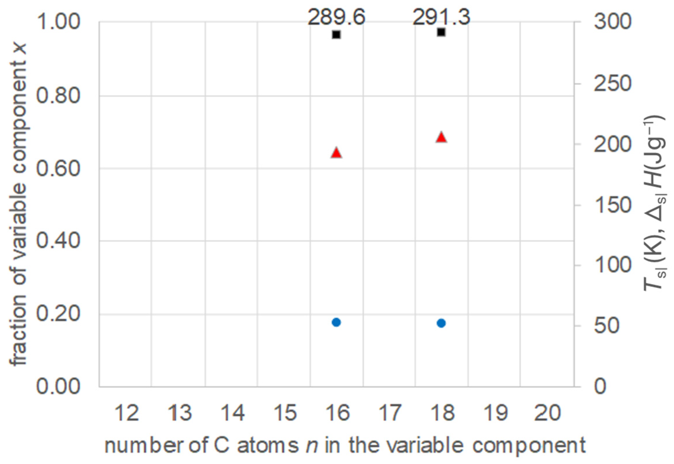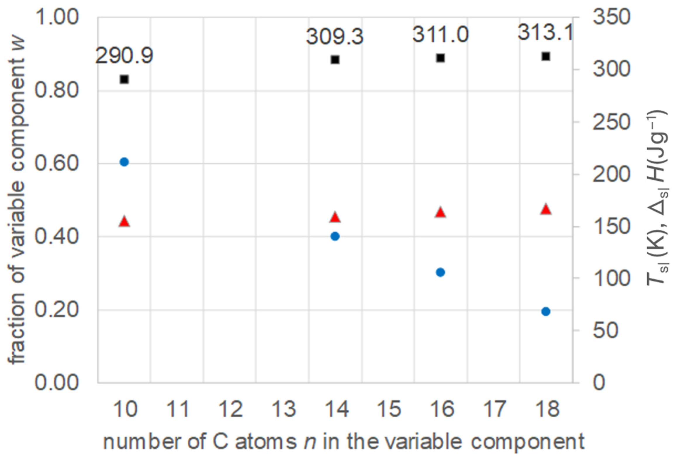 - Regarding PCM development, a systematic trend in Tsl and in the fraction w or x of eutectics (Figure 14) allows us to predict probable Tsl and w or x of new eutectics from a few known ones. For example, knowing Tsl for mixtures of n-alkane n = 14 with n = 17, 19, and 21 (Figure 6), it is likely that mixtures with other odd n outside that n range have higher Tsl for higher n, and lower Tsl for lower n, or to fill gaps with regard to n. This can be performed as well by theoretical models. Theoretical models work for any mixture, can even predict what can be mixed, the phase diagram which allows to assess the phase change behavior, even if a eutectic exists at all. However, specifically regarding Tsl, the trends seem to be more precise than some models. Even more, theoretical models require at least knowledge of Tsl and ΔslH of the components, thus literature data or own measurements. However, if a component decomposes before melting, these data cannot be determined at all.