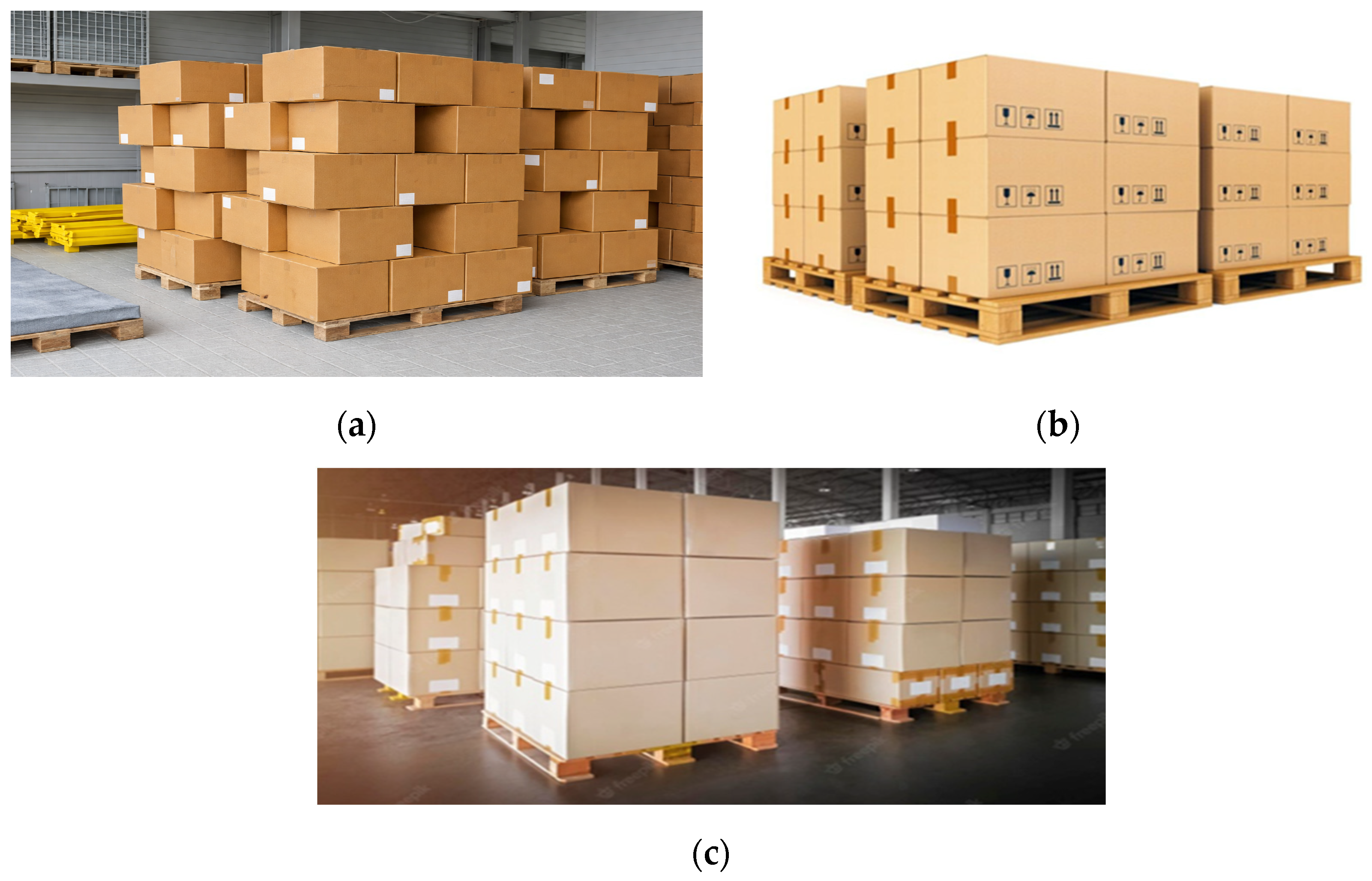 Possible problems of placing the boxes on the pallet (a,b) and the ideal dimensions of boxes for optimal placement on a pallet (c), [32] (pp. 1474–1481).