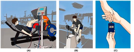Pressurized treatment was administered using a 9 cm wide, 80 cm long automatic tourniquet system (DTS-2000w; Daesung Maref Co., Ltd., Gunpo, Republic of Korea). The intensity of the BFRRT pressure was set between 100 and 130 mmHg [41,42]. Before each exercise session, an incremental pressure of 100 mmHg was applied, which gradually increased by 5 mmHg every 4 weeks throughout the 12-week exercise program. The HRT group performed exercises similar to those of the BFRRT group, but without the use of BFR, using weights equivalent to 75–80% of 1RM. Conversely, the LRT group used weights equivalent to 25–30% of 1RM.