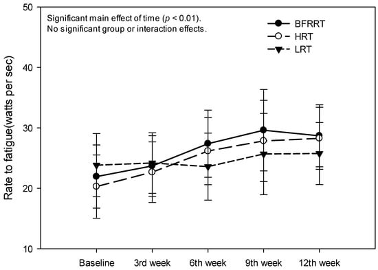Rate of fatigue based on the test performed. BFRRT, blood flow restriction resistance training; HRT, high-load resistance training; LRT, low-load resistance training. Values are presented as mean ± 95% confidence intervals.