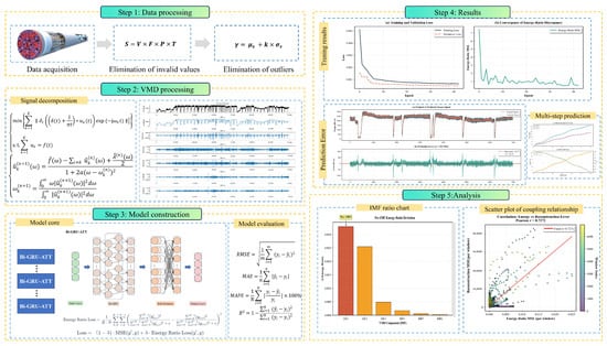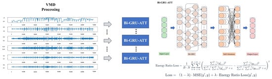 To bridge this gap, this work advances the state of the art in three key aspects. First, we explicitly address the information loss problem by introducing a novel Energy Ratio Loss function. This physics-informed regularizer quantifies and penalizes deviations in the modal energy distribution between predicted and true sub-signals during training. By enforcing energy conservation across modes, it ensures that the long-term temporal structure and physical consistency of the reconstructed torque signal are preserved, which is a novel contribution not present in prior works like [24,25,35]. Second, we move beyond merely assuming decomposition effectiveness by providing a quantitative analysis of modal importance during model fitting. By tracking energy ratio deviations across different VMD modes before and after the decomposition-reconstruction process (see Section 4), we can precisely quantify which frequency bands contribute most to prediction accuracy and which are prone to information loss. This analytical approach provides concrete evidence for the effectiveness of the decomposition. Third, we demonstrate a concrete improvement in the multi-step forecasting framework for tunneling. By integrating VMD, Bi-GRU, and self-attention within this energy-constrained framework, our model achieves superior prediction accuracy for a substantially extended horizon of 30 steps (see Section 4), significantly outperforming existing decomposition-based models that are typically validated on much shorter sequences.