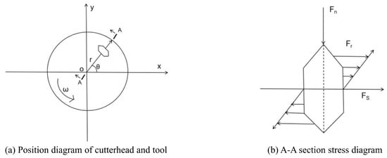 In the process of excavation by TBM, the cutterhead is subjected to normal force, rolling force and lateral force. The torque force model of the cutterhead is illustrated in Figure 2. The radius r, the angle , the rotational speed of the cutterhead , the normal force , the rolling force and the lateral force are all defined in this model.