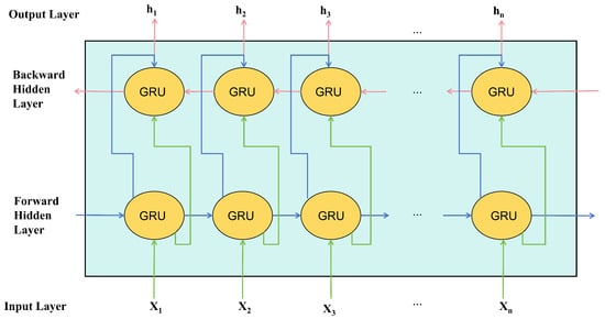 While the Bi-GRU model itself follows established deep learning practices [38,39], its application here is tailored for frequency-specific modeling. In this framework, the Bi-GRU hidden states for all modal components are not end predictions; rather, they are aggregated and further refined by attention and energy-constrained fusion modules (see Section 2.4 and Section 2.5).