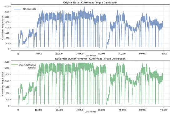 We compare the results obtained before and after outlier processing of three consecutive days of cutterhead torque data. As illustrated in Figure 6, the original data demonstrates significant fluctuations, particularly in the torque values of the cutter disc, which exhibit substantial high and low variations. These outliers may be attributed to measurement errors, sensor failure or other abnormal factors. In contrast, the processed data exhibits a reduced fluctuation range and is more concentrated within a reasonable range, manifesting as a more stable and smooth trend. This is advantageous for subsequent analysis and modelling.