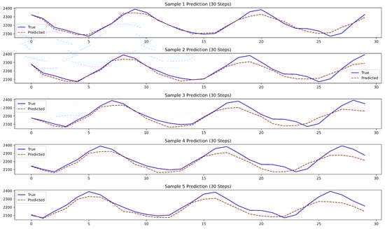 In order to verify the prediction performance of the proposed method and to consider the information loss in the signal decomposition-reconstruction process, a comparison was made of the prediction results of the test set with the reconstructed cutterhead torque signal (the result of linear superposition of real sub-signals) and the original cutterhead torque signal, respectively. As illustrated in Figure 9, the multi-step prediction results of the proposed method on the test set are compared with the reconstructed cutterhead torque signal (with 5 prediction samples) after training in this experiment. As illustrated in Table 4 and Figure 10, the paper presents the step-by-step prediction accuracy metrics and their trends in relation to the reconstructed cutterhead torque signal on the test set. It can be seen that the algorithm proposed in this paper has high prediction accuracy for the reconstructed cutterhead torque signal. The RMSE, MAE, MAPE and R2 values of the 30-step prediction results are not less than 161.24, 113.72, 7.48% and 0.9346, respectively.