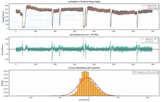 VBGAP forecast versus actual cutterhead torque and its absolute error. ((a) comparison of original and predicted torque signals; (b) prediction error time series; (c) error distribution with normal fit).