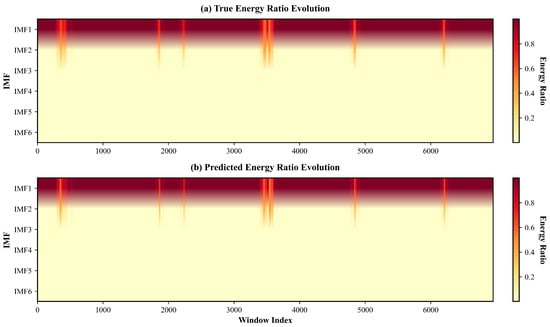 To further explore the mechanism by which the energy ratio loss function constrains the energy distribution in the reconstructed signal and thereby reduces information loss, we conducted a series of visual analyses. Physically, the energy ratio loss acts as a soft conservation law: it penalizes any artificial creation or dissipation of modal energy during the decomposition–reconstruction cycle, mimicking the principle of energy conservation that governs real cutterhead dynamics. By keeping the relative energy share of each IMF constant, the loss discourages the model from “borrowing” energy from high-frequency modes to fit low-frequency trends (or vice-versa), a situation that often produces visually plausible but physically implausible torque trajectories. Figure 12 presents heatmaps of the energy ratio evolution for each VMD modal component (IMF) across all data windows. Panel (a) shows the true energy ratio evolution, while panel (b) displays the predicted ratios generated by the proposed model. It is evident that the predicted energy distribution closely tracks the true distribution for the dominant components (IMF1 and IMF2), demonstrating the model’s ability to preserve modal energy profiles over time. Lower-order IMFs (IMF3–IMF6) maintain minor yet stable energy ratios, indicating that the energy ratio loss function effectively compels the model to maintain a physically meaningful modal energy structure throughout the prediction process. Figure 13 further reveals that energy ratio deviations predominantly arise in the leading modal component (IMF1), with higher-order components contributing negligible error. This outcome demonstrates that the energy ratio loss function specifically targets the principal energetic content, enabling the model to effectively constrain and preserve the most informative features.