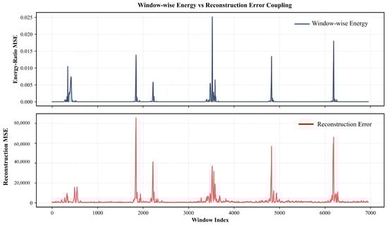 Window-wise coupling of energy ratio mean squared error (MSE) and signal reconstruction MSE. Peaks in energy-ratio error correspond to spikes in reconstruction error, indicating regions of reduced modal energy consistency and increased information loss.