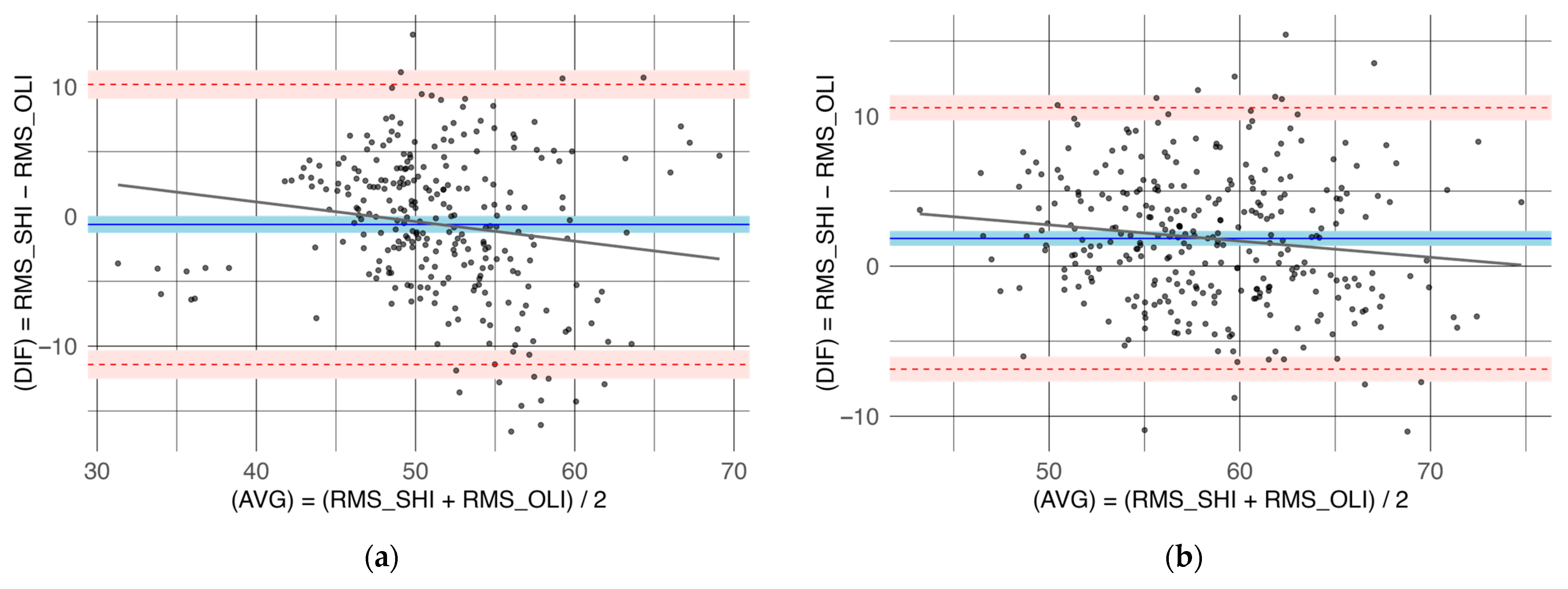 For Bland–Altman analysis, the difference DIF = SHI − OLI and mean AVG = (SHI + OLI)/2 were computed for each metric and task [