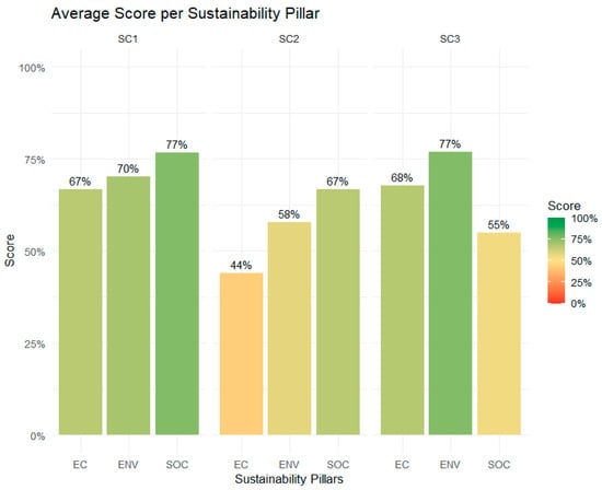 For SC1, the results obtained using the weighting scheme proposed in this paper show a predominant economic contribution (EC ≈ 41%), followed by the social (SOC ≈ 31%) and environmental (ENV ≈ 28%) pillars. A very similar distribution is observed under the equal-weight scheme, suggesting that the baseline weighting does not strongly bias the results toward a specific pillar. When the process-driven (PRO-driven) weighting is applied, the social pillar becomes more prominent (SOC ≈ 35%), reflecting the stronger emphasis of process-related aspects on organisational, operational, and workforce-related dimensions. In contrast, the final-product-driven (FP-driven) scheme markedly amplifies the economic contribution (EC ≈ 59%), while reducing both environmental and social contributions. This highlights how market-related and product performance criteria tend to dominate sustainability outcomes when final product aspects are prioritised. Conversely, the residue-driven (RES-driven) scheme increases the environmental contribution (ENV ≈ 33%), confirming that residue-related criteria are more closely associated with environmental performance. Despite these shifts, the overall balance among pillars remains coherent, and no inversion of sustainability dominance occurs.