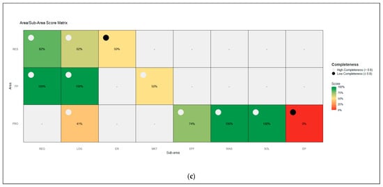 Area × sub-area sustainability matrix for Scenario 1 (a), Scenario 2 (b), and Scenario 3 (c) showing the percentage of positive expert responses. Black and grey dots indicate completeness levels ≤ 0.8 and >0.8, respectively.