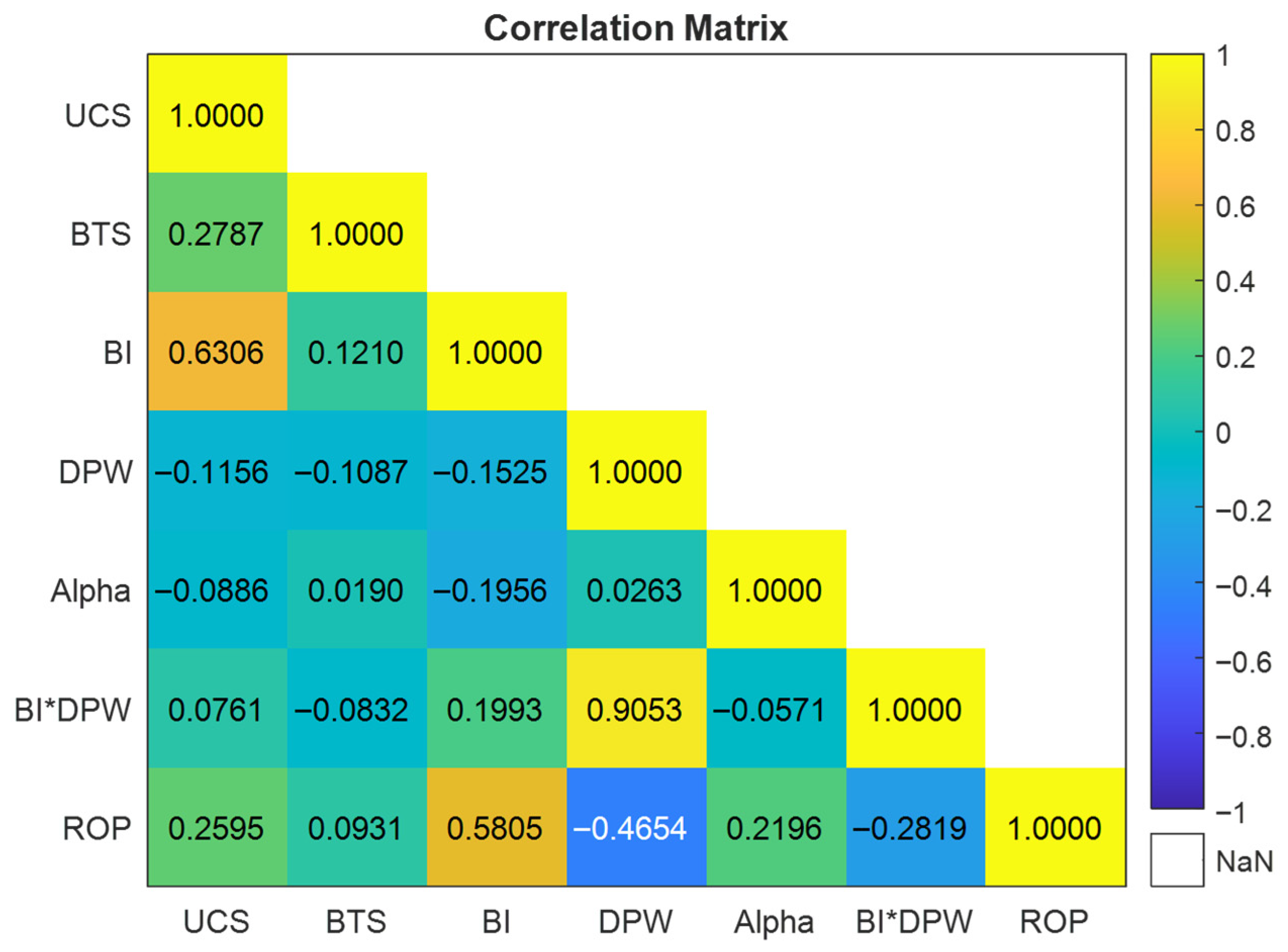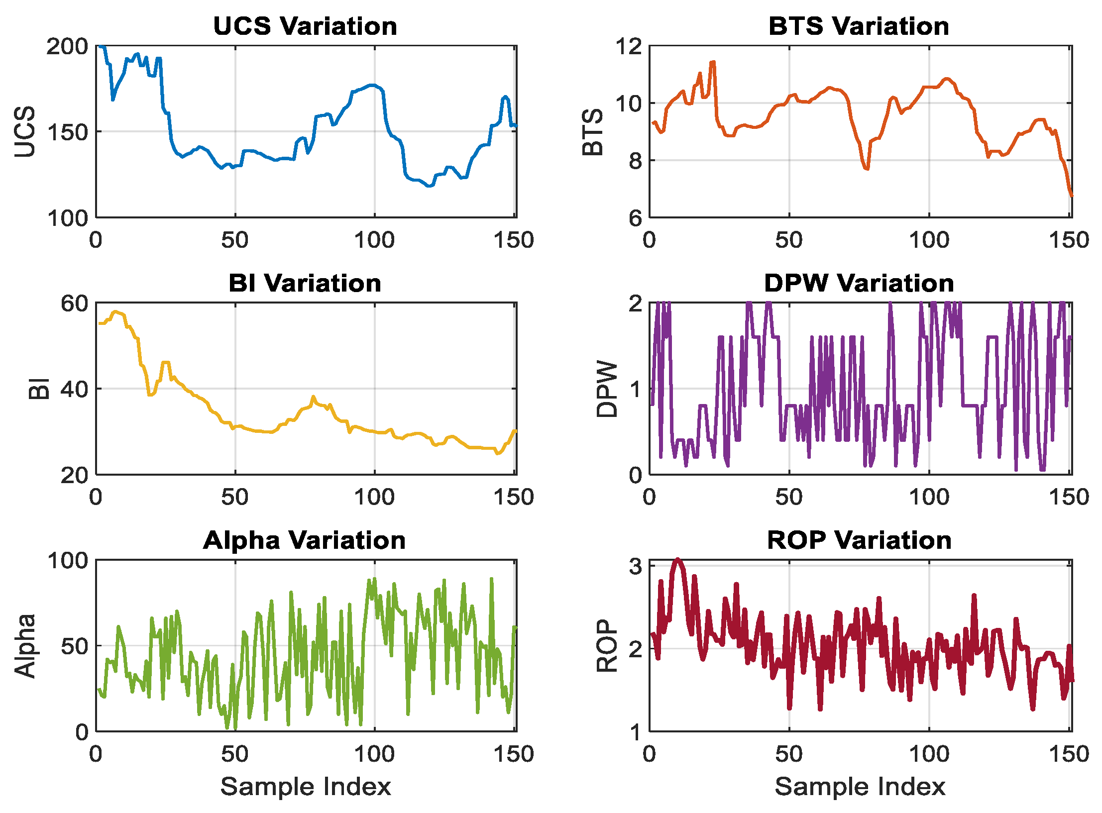 Figure 2 indicates that the strongest positive relationship with the penetration rate (ROP) is observed for the rock brittleness index (BI) (r = 0.5805), followed by uniaxial compressive strength (UCS) (r = 0.2595). The sensitivity results shown in