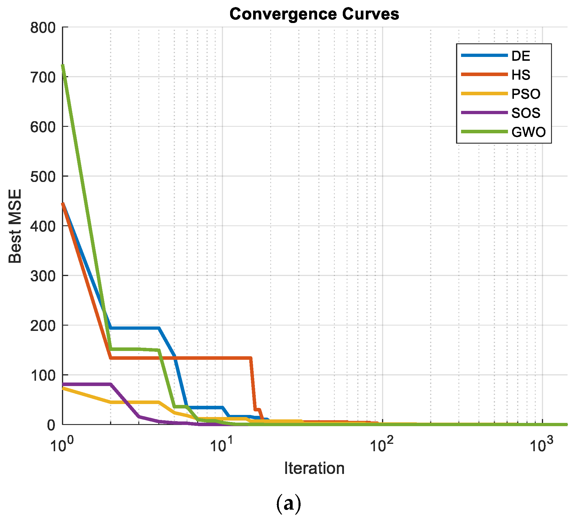 Table 5, the DE and SOS algorithms yielded the best performance across all error evaluation criteria, whereas the other algorithms became trapped in local optima. The convergence behavior of the algorithms for the M6 model is illustrated in