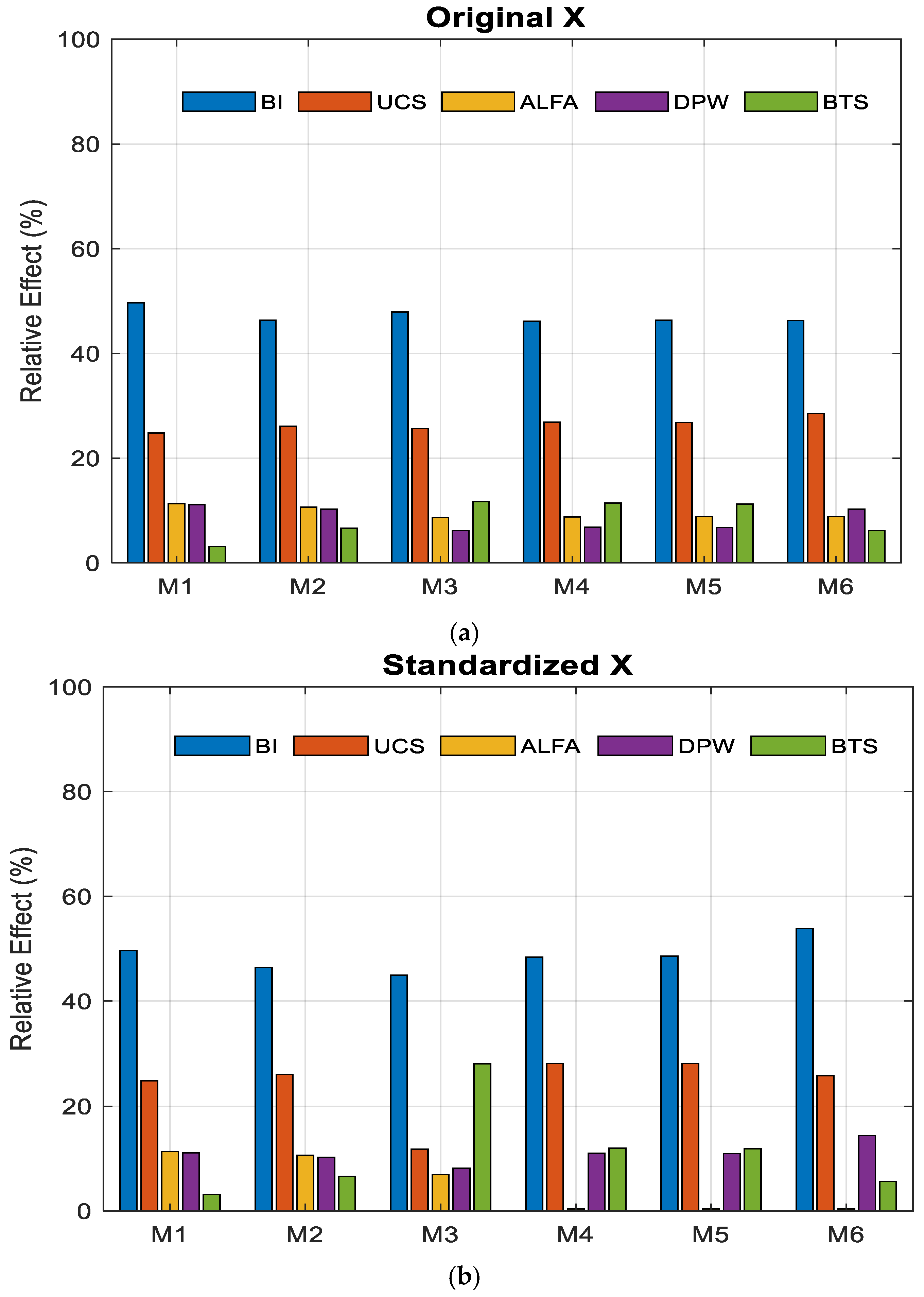 Table 9 presents the relative importance of input variables obtained for the Random Forest (RF), Bagged Trees (BT), SVM, and GAM methods under Scenario I (original variables) and Scenario II (standardized variables). The findings indicate that the models produce largely consistent results across both scenarios and exhibit similar learning dynamics in terms of variable prioritization.