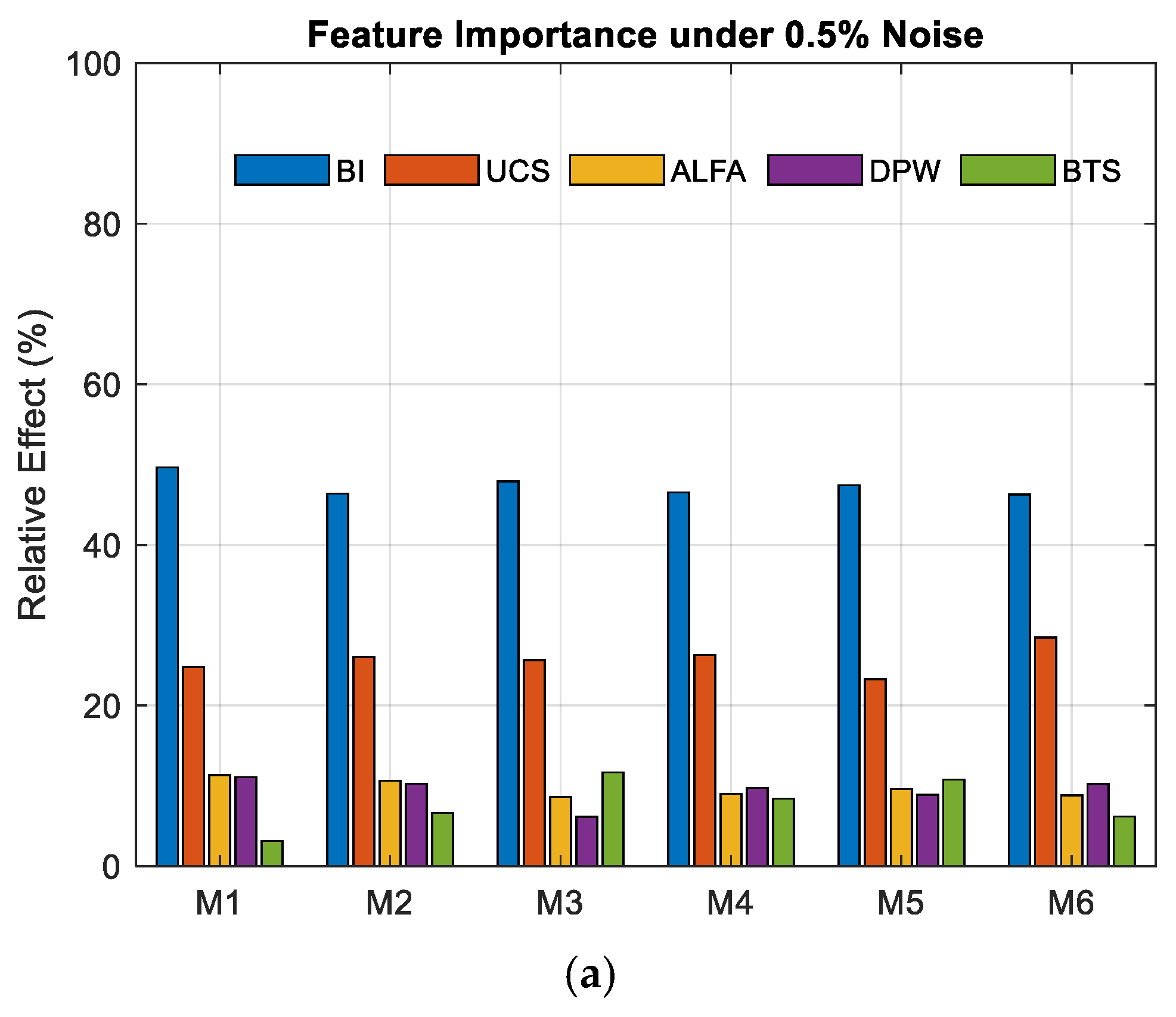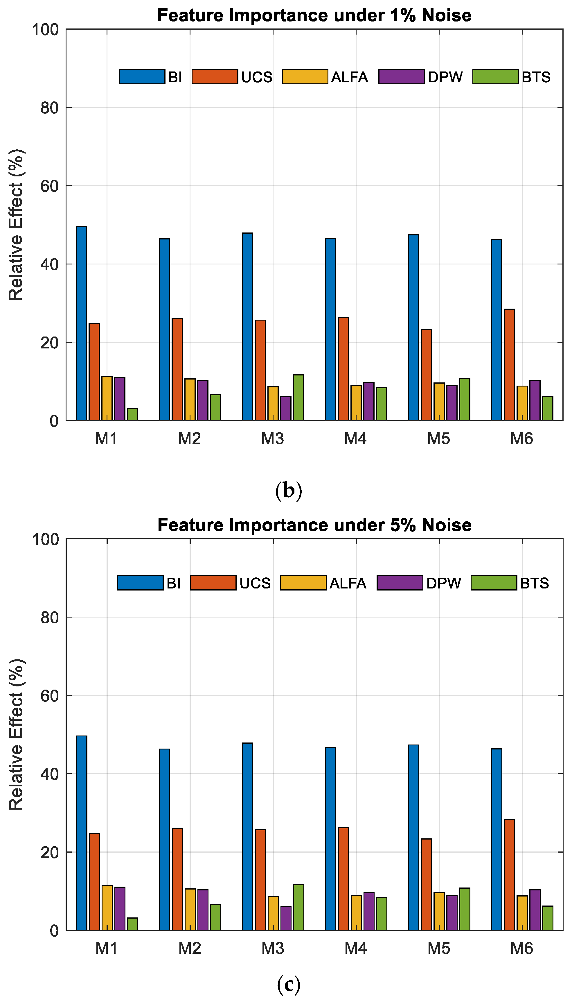 Figure 5 illustrates how the relative sensitivities of input variables in the developed parametric models (M1–M6) vary under different noise levels. The panels represent cases with multiplicative Gaussian noise levels of (a) 0.5%, (b) 1%, and (c) 5%, respectively. All sensitivity values were computed based on the Jacobian-based elasticity analysis and subsequently normalized.