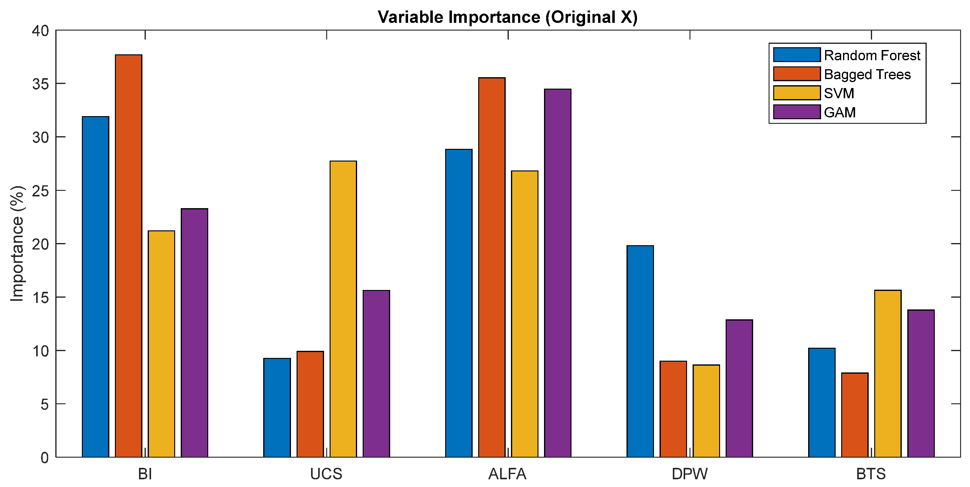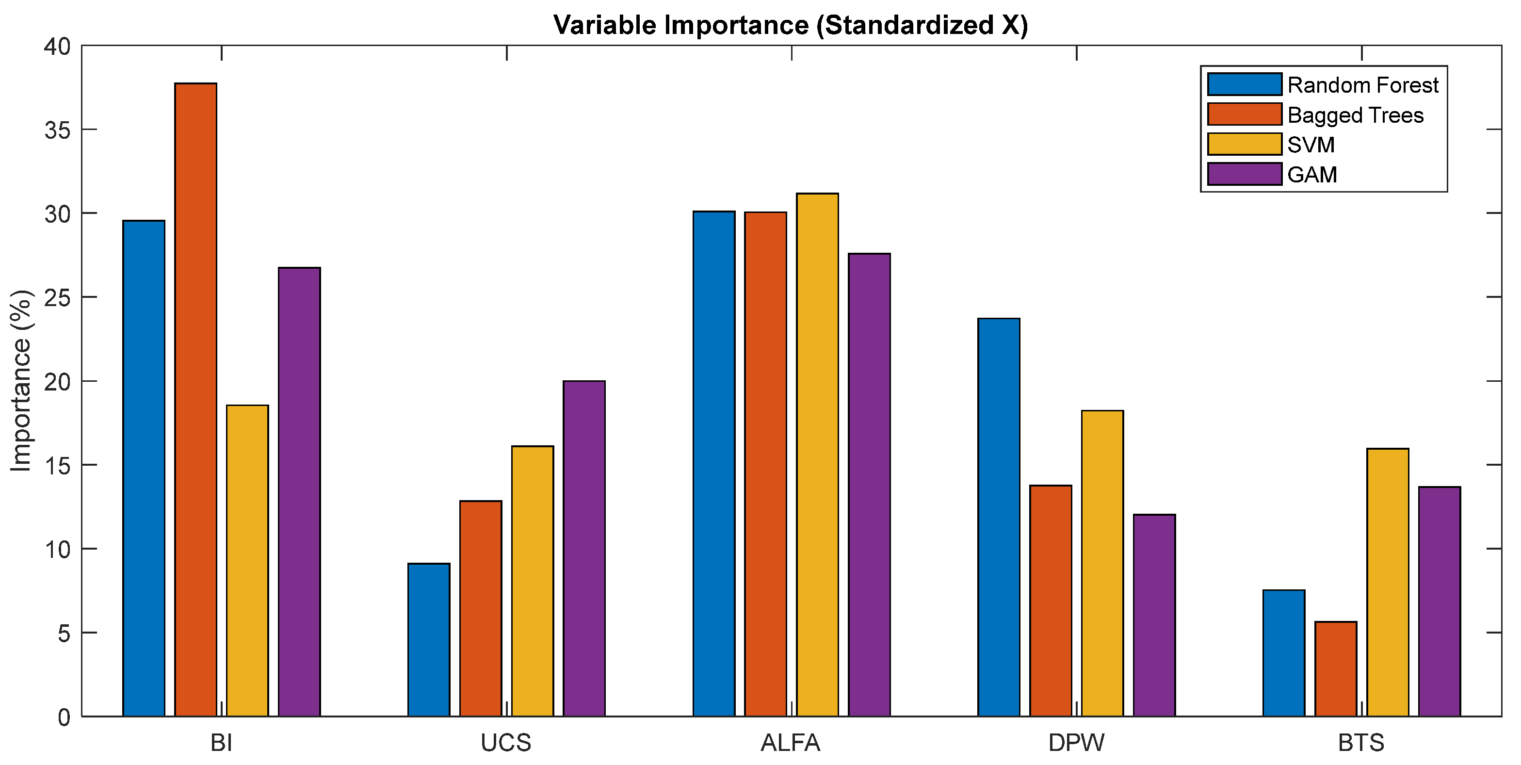 Table 9 presents the variable importance results for Random Forest (RF), Bagged Trees (BT), SVM, and Generalized Additive Model (GAM) under Scenario I (original data) and Scenario II (Z-score standardized data).