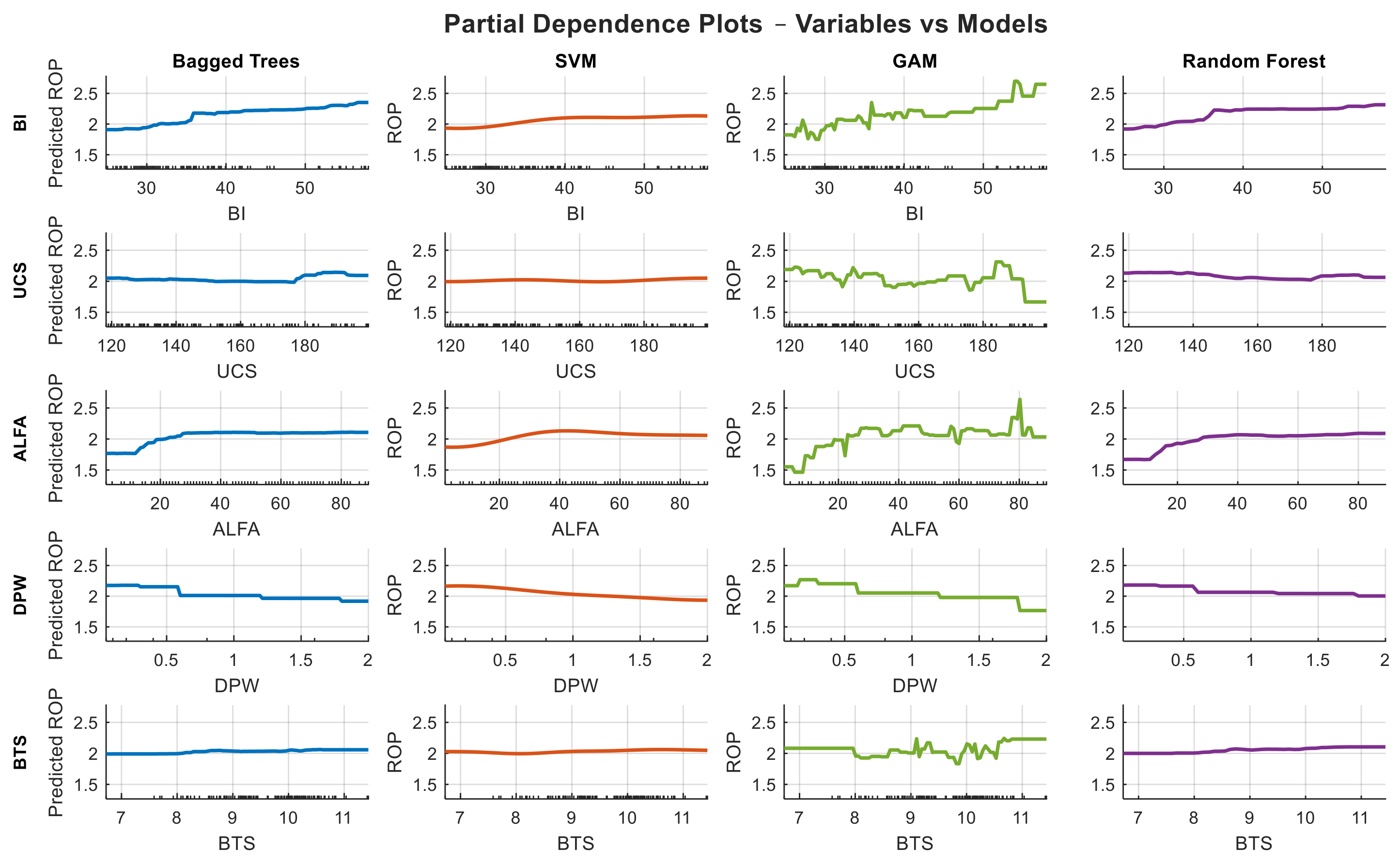 For reliable modeling of TBM penetration rate, high predictive accuracy alone is insufficient; transparency and interpretability of model decision mechanisms are equally critical. Accordingly, Partial Dependence Plots (PDP) and Accumulated Local Effects (ALE) analyses are employed to investigate the influence of input variables on ROP within the selected machine learning models. As black-box models do not permit analytical differentiation, numerical differentiation techniques are applied. These analyses provide both global and local insights into variable effects, enhance model interpretability, and enable a reliable and comprehensive assessment of factor influence in TBM penetration rate prediction.