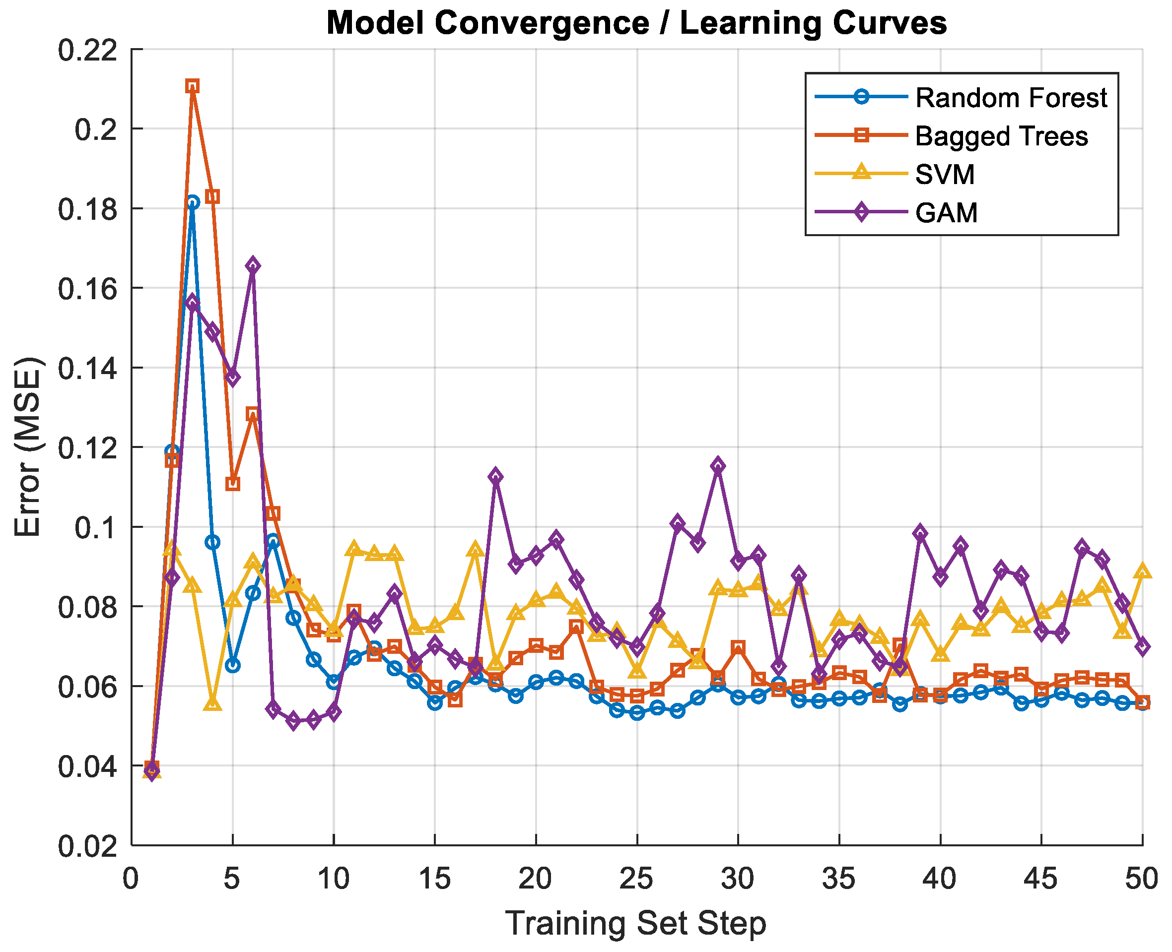 Figure 8 clearly shows that while GAM and SVM display a more fluctuating learning process, Random Forest (RF) and Bagged Trees (BT) maintain a relatively stable performance throughout the training stages.