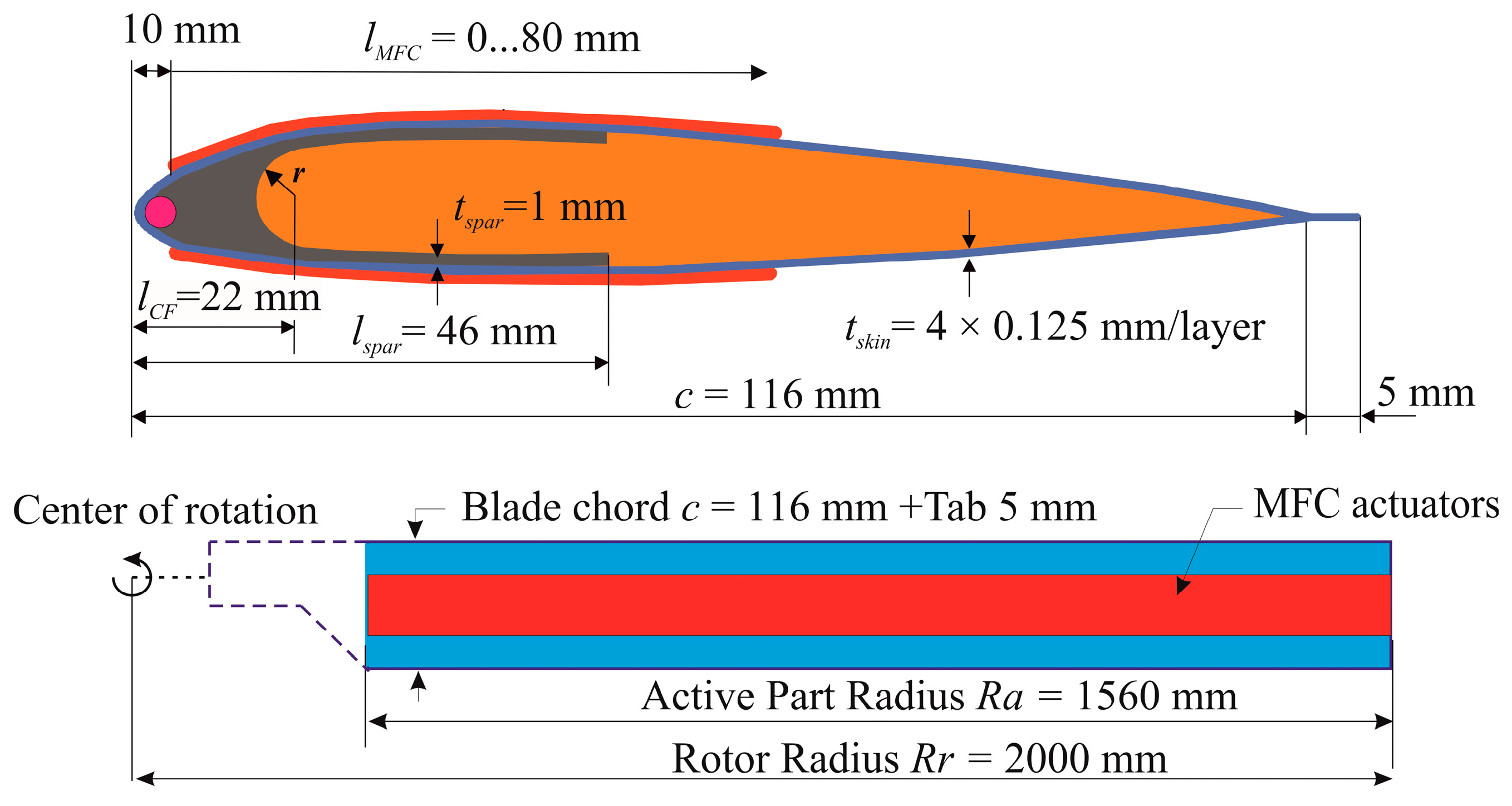 - Monner, H.P.; Opitz, S.; Riemenschneider, J.; Wierach, P. Evolution of active twist rotor designs at DLR. In Proceedings of the 49th AIAA/ASME/ASCE/AHS/ASC Structures, Structural Dynamics, and Materials Conference, Schaumburg, IL, USA, 7–10 April 2008; pp. 5080–5090. [Google Scholar] [CrossRef]