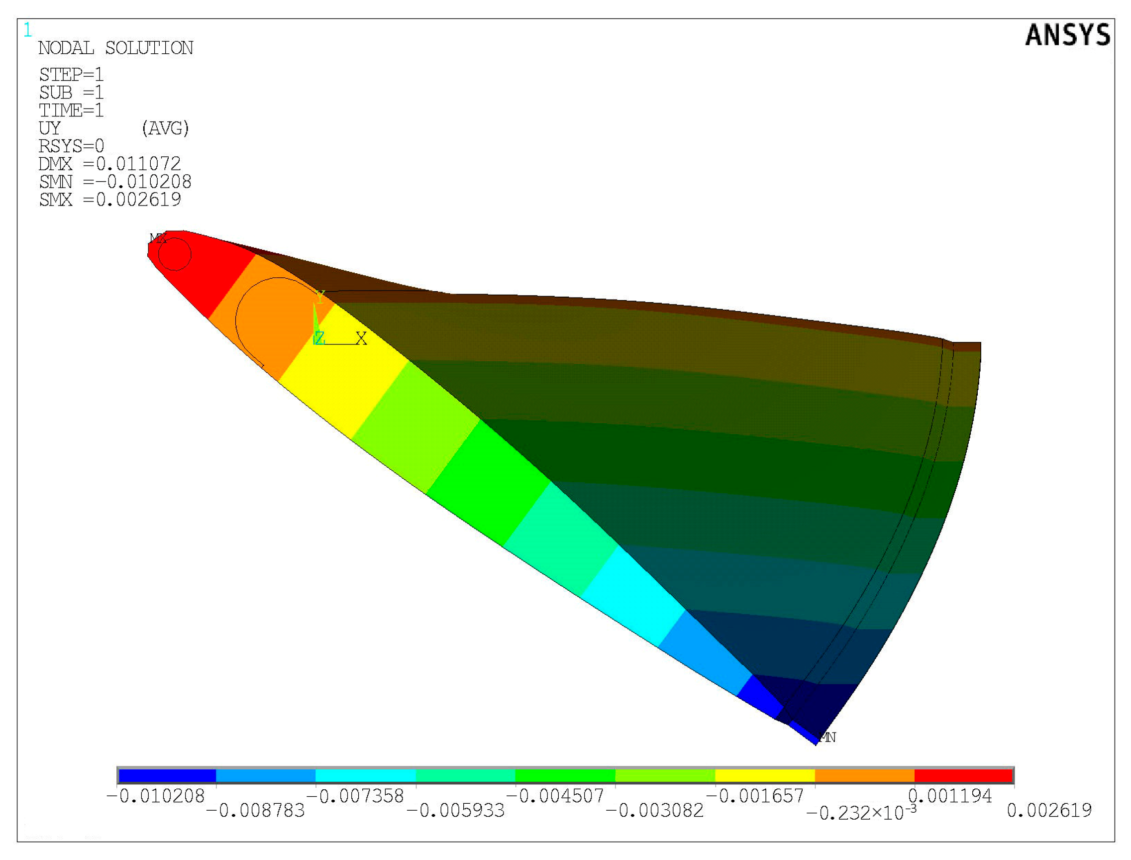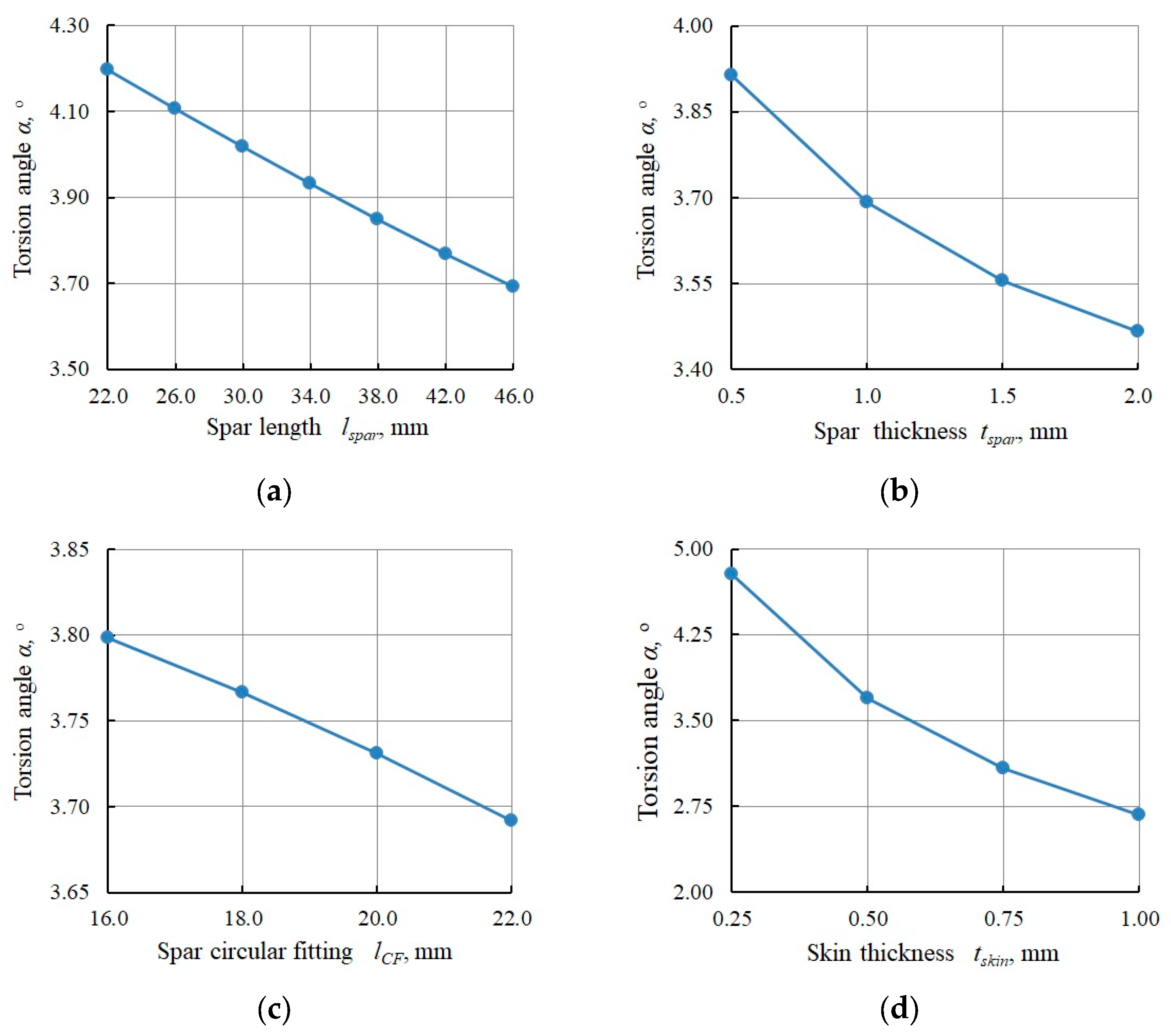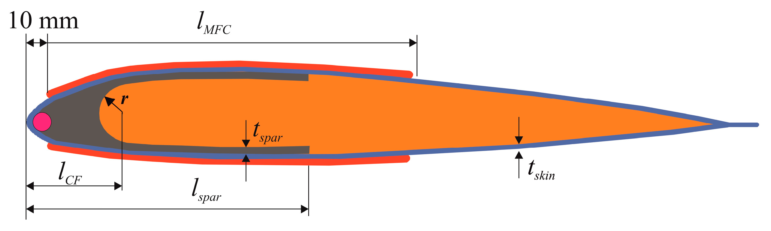 - The influences of the blade’s cross-sectional dimensions were investigated without changing the aerodynamic profile. The spar flange thickness and spar flange length showed a negligible effect on the twist angle. Skin thickness had the greatest influence, accounting for ~57% of the twist angle. To activate the piezoelectric effect, the thermal analogy was used.