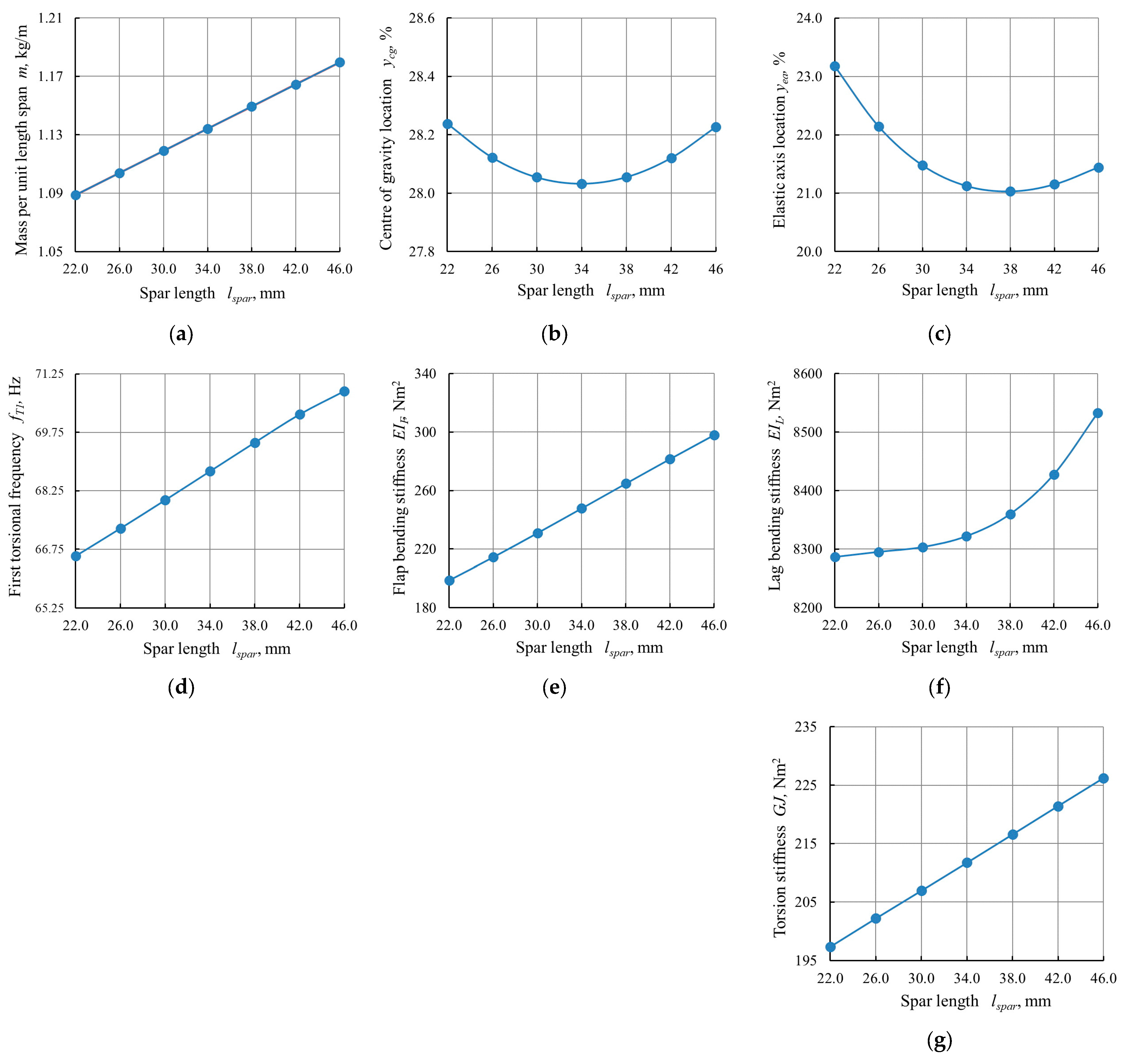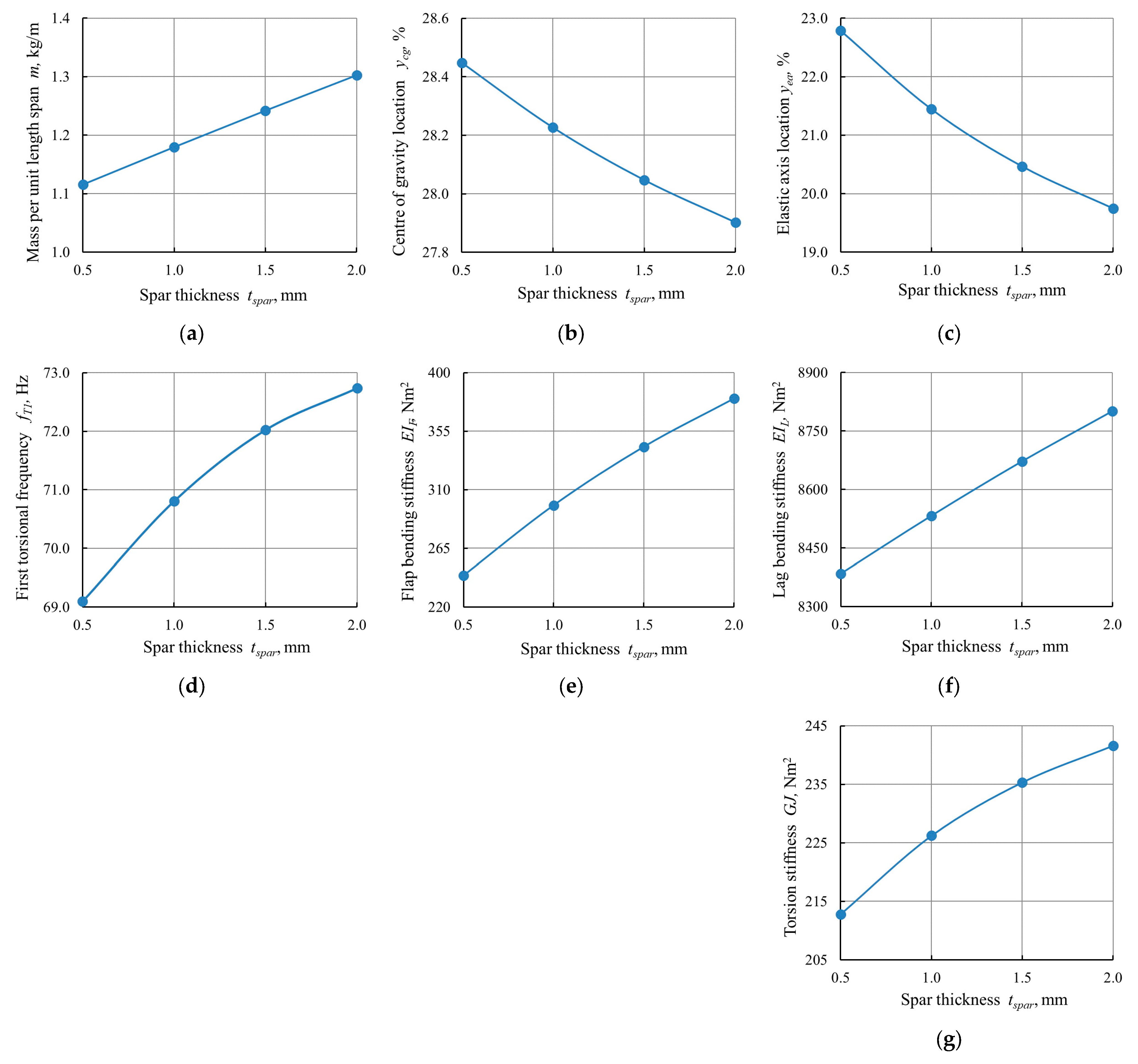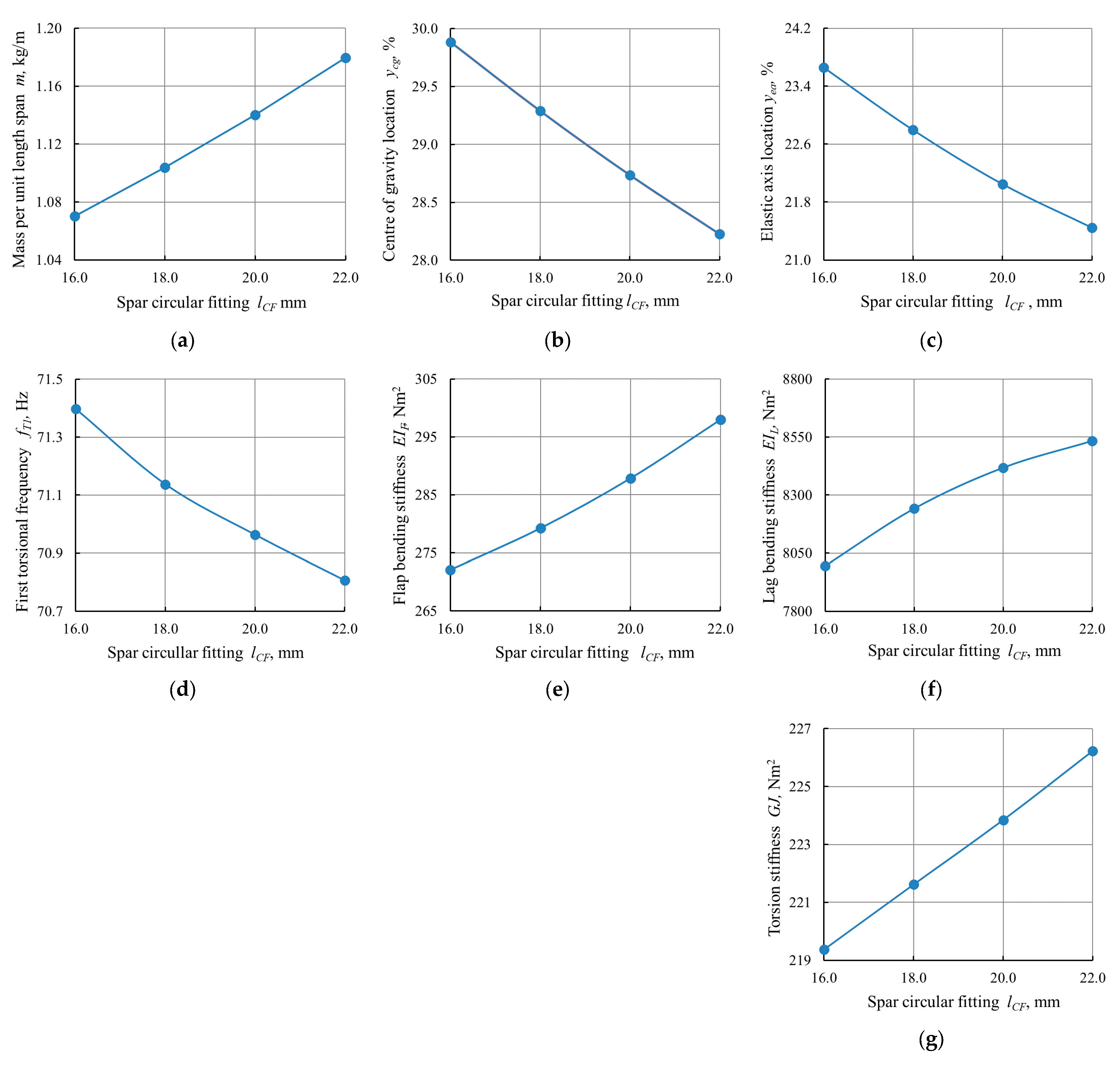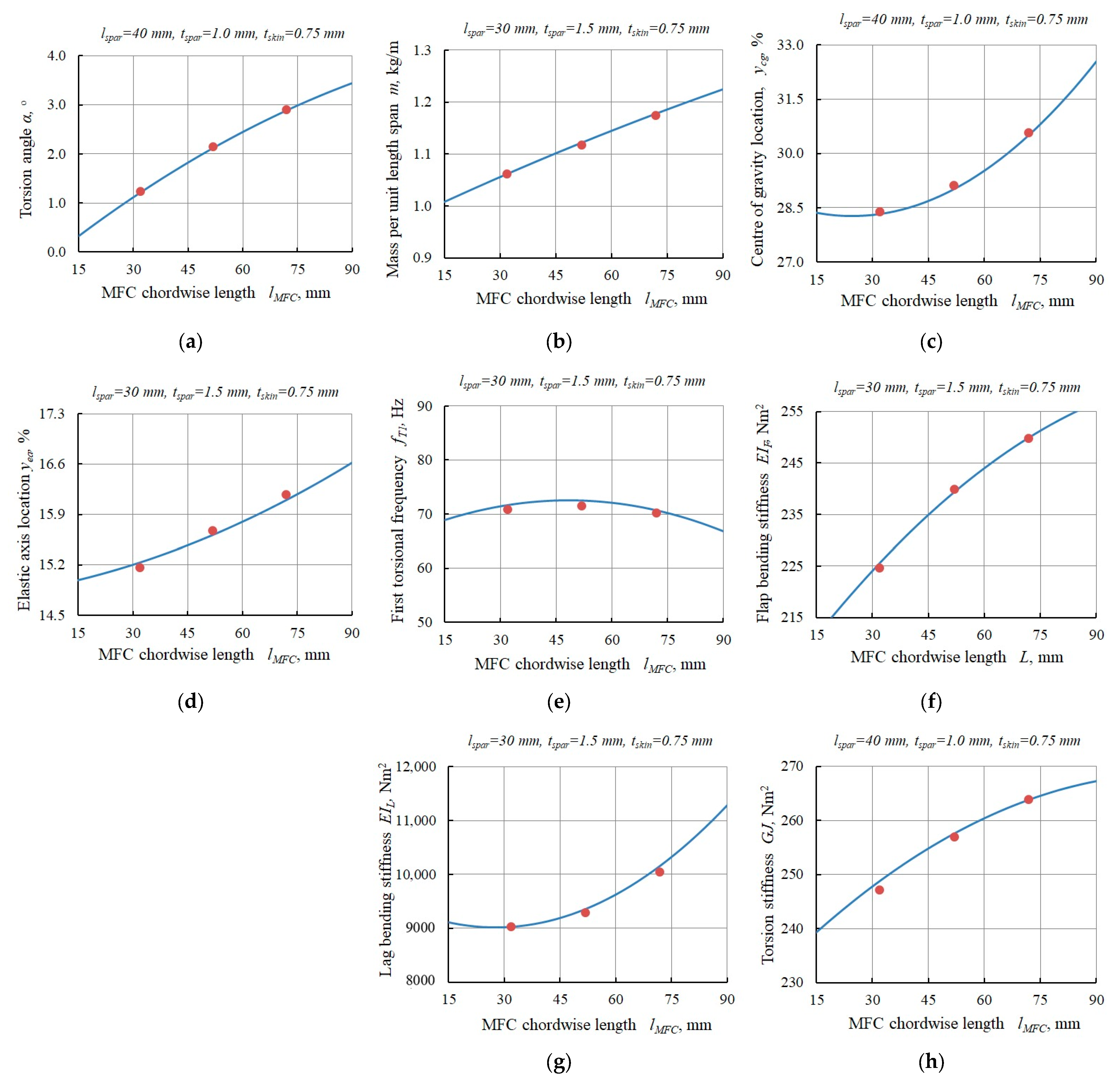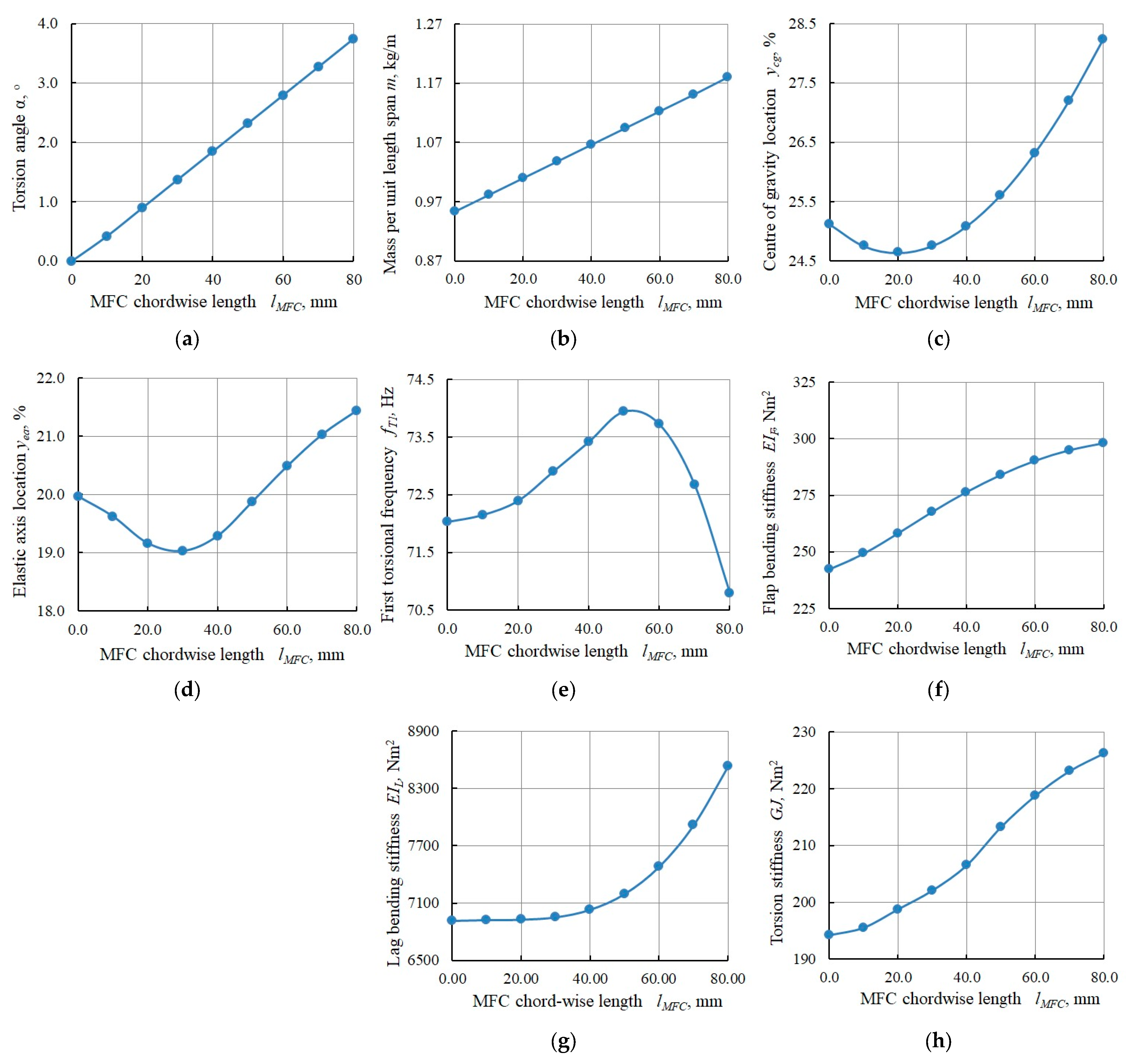 - It was established that, with the optimised geometric parameters of the cross-section, the maximum active twist reaches 5.2°, while the positions of the elastic axis and the centre of gravity exhibit only minor deviations from those of the reference model. The placement of the piezoelectric actuators significantly influences both the flapwise bending and torsional stiffness of the blade.