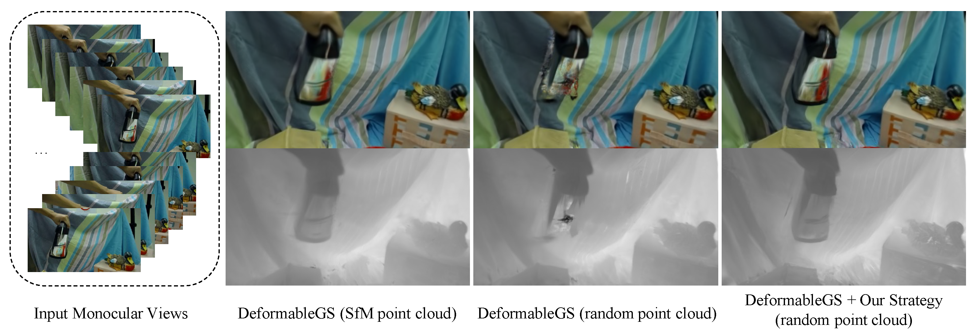 - We introduce an innovative optimization approach that relaxes the requirement of initial point cloud for monocular dynamic scene reconstruction, providing the possibility of using Gaussian Splatting in situations where obtaining accurate point clouds is challenging.