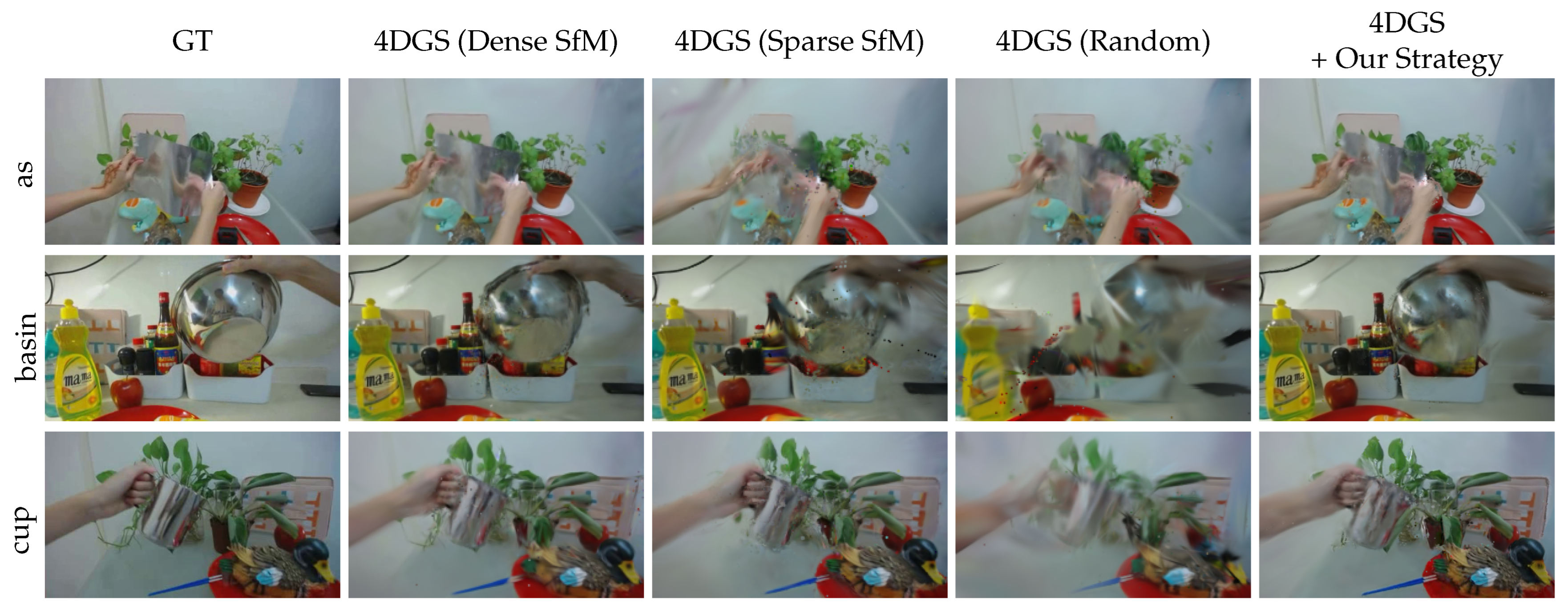 | 4DGS + Our Strategy | Random | 27.50 | 0.2729 | 0.7732 | 26.54 | 0.2369 | 0.8620 |