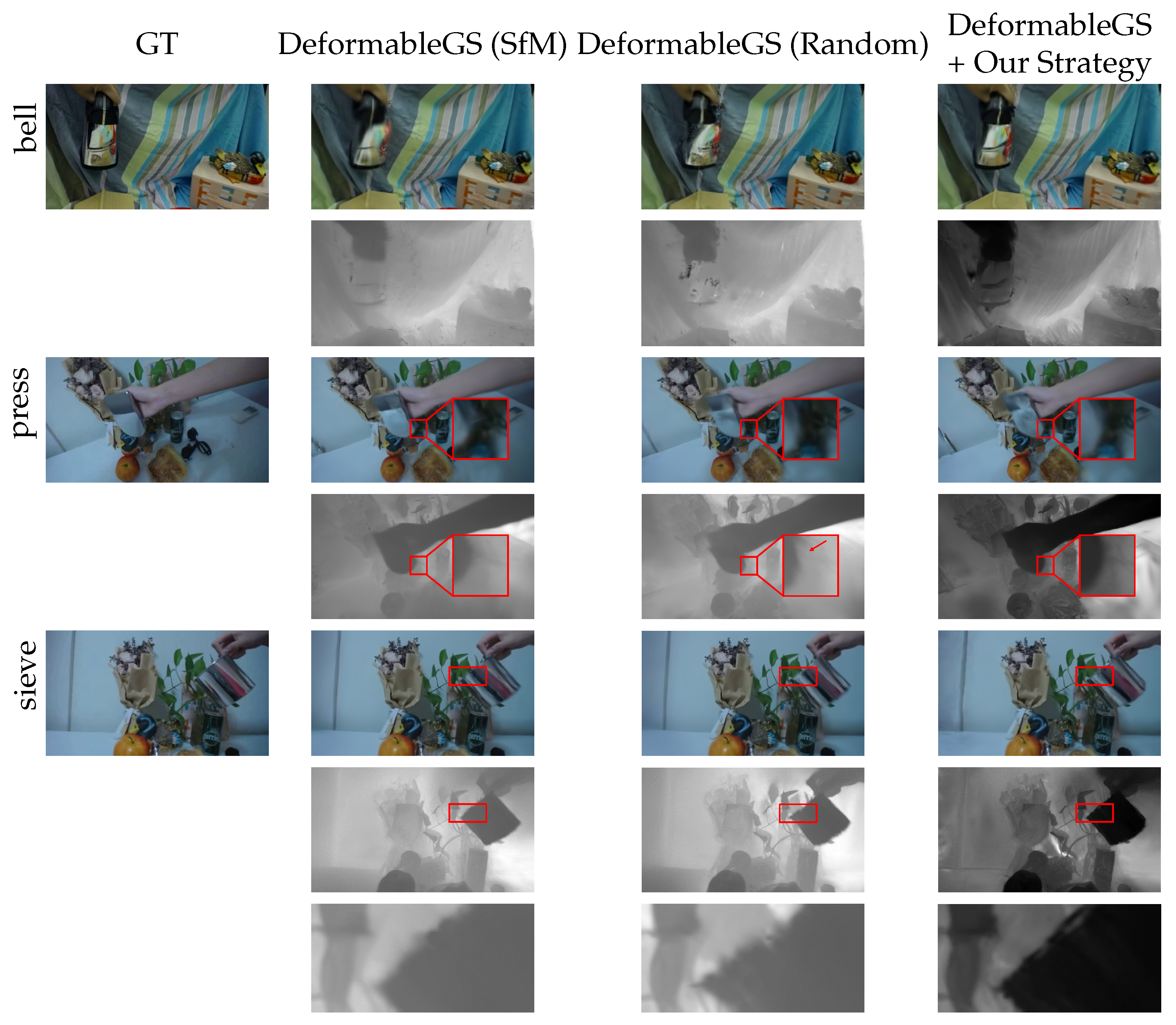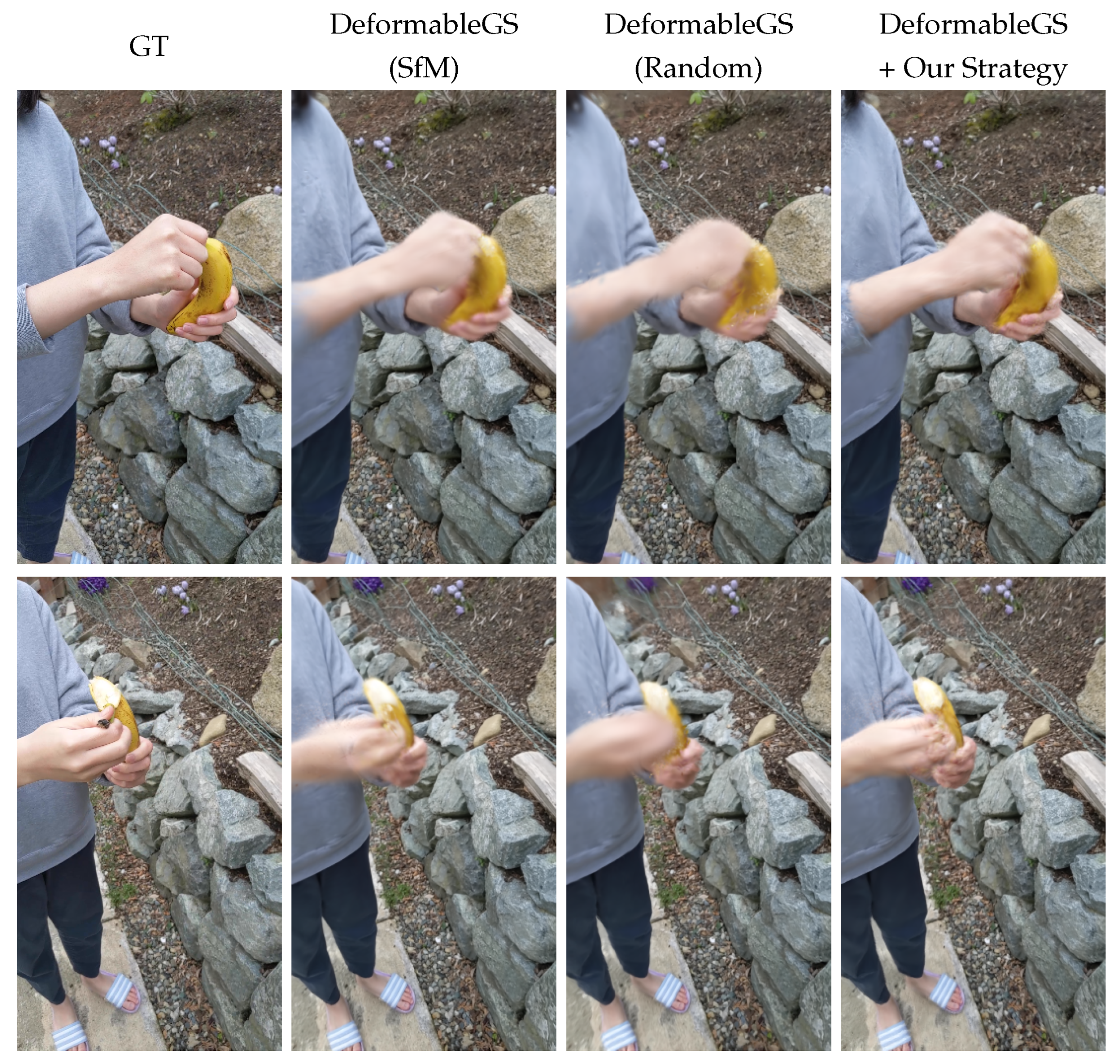 | Method | TiNeuVox | HyperNeRF | NeRF-DS | DeformableGS | DeformableGS + Our Strategy | 4DGS | 4DGS + Our Strategy | |||