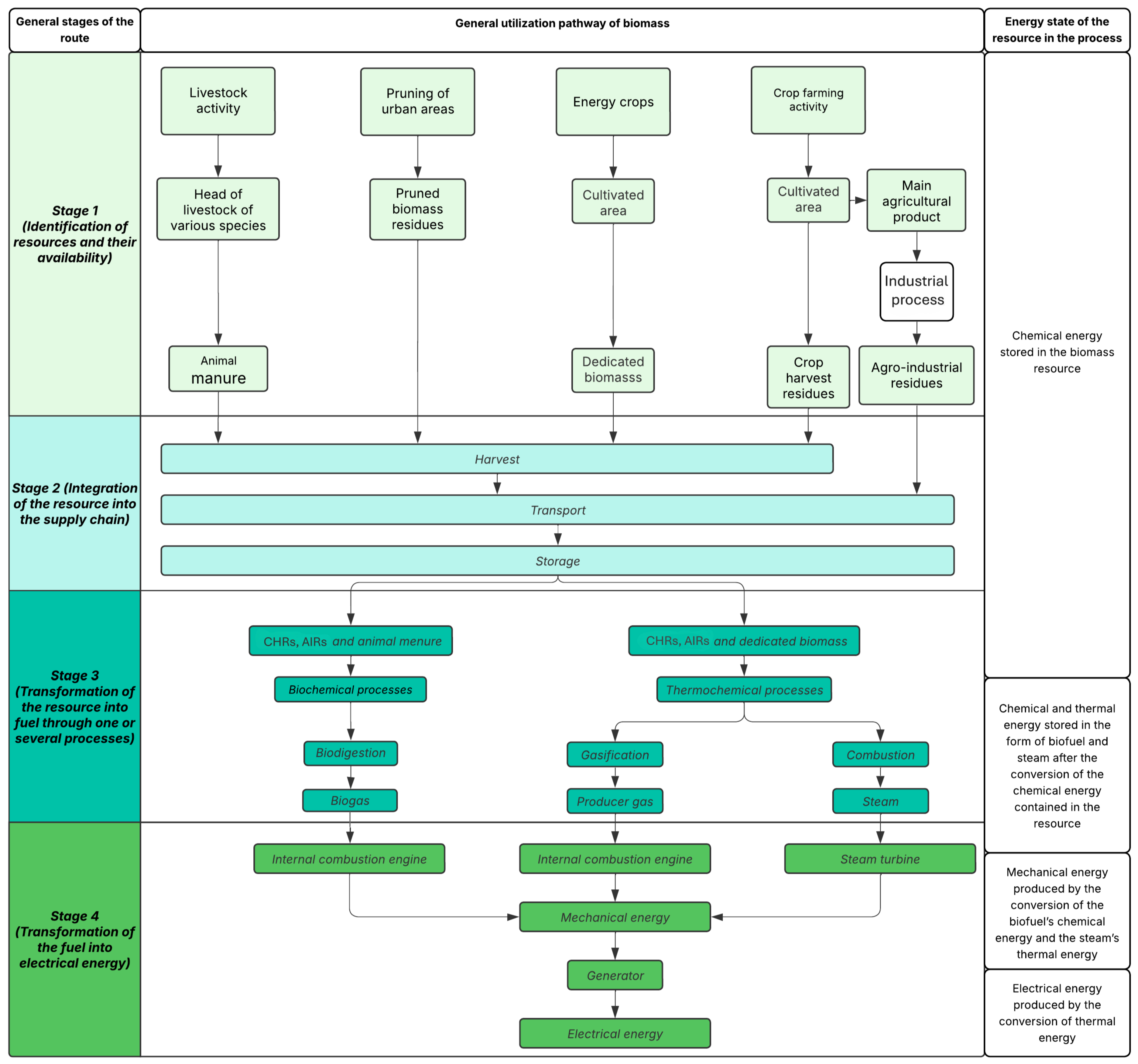 - Analysis of the utilization pathwayIn the third phase, the biomass utilization pathway was addressed, understood as the process that leads from resource availability to its conversion into electrical energy. The analysis included logistical aspects (collection, transport, and storage), technological aspects (pre-treatment and thermochemical or biological conversion), and energy aspects (efficiency and process losses). This step was used to identify critical factors and potential bottlenecks in the transformation chain.