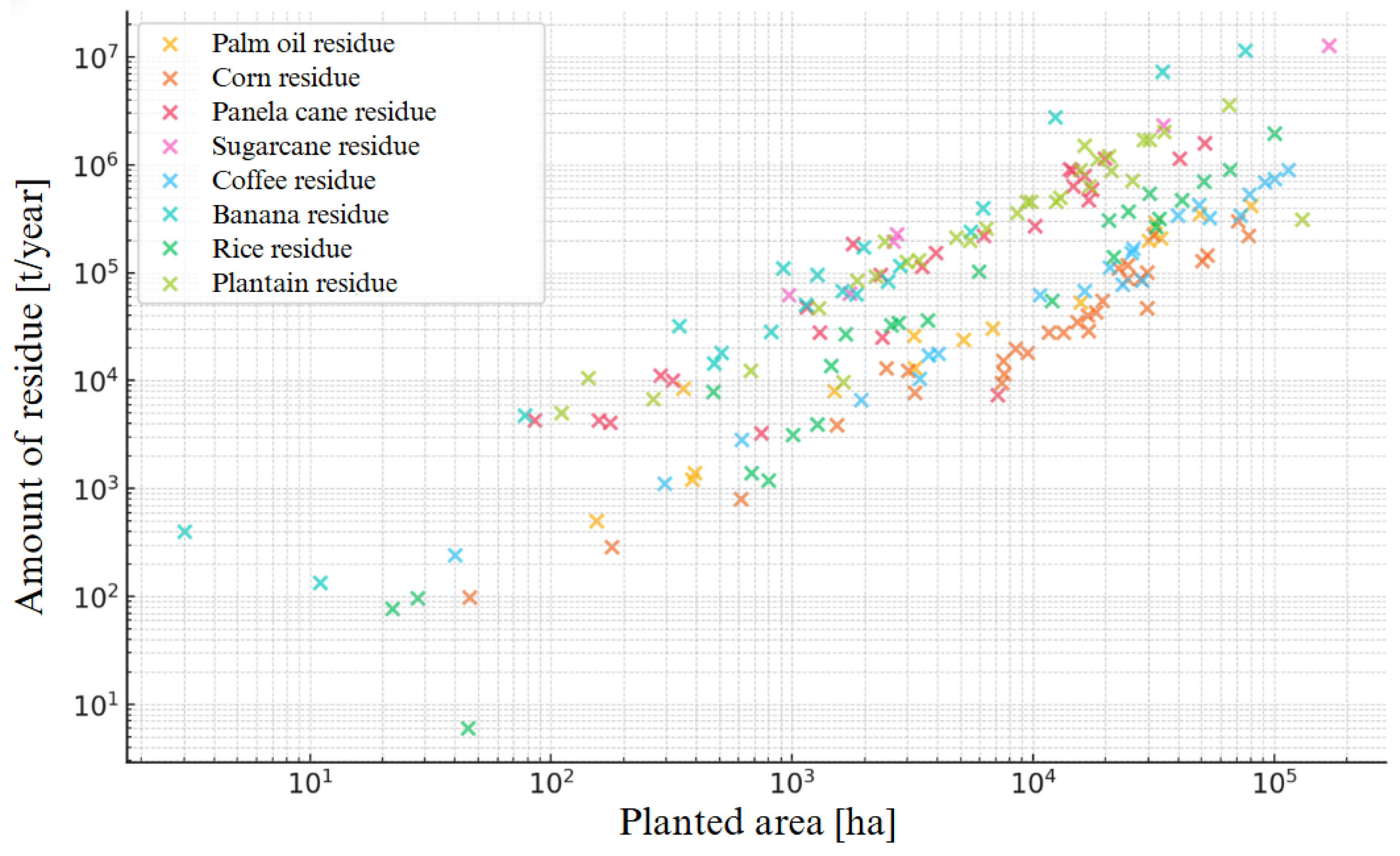 - Dedicated crops. In Colombia, energy crops are mainly oriented toward the production of liquid biofuels (biodiesel and fuel alcohol) for transportation [12,26]. However, their residues can be utilized similarly to agricultural residues, applying thermochemical processes and the same EP formulation [4,28].