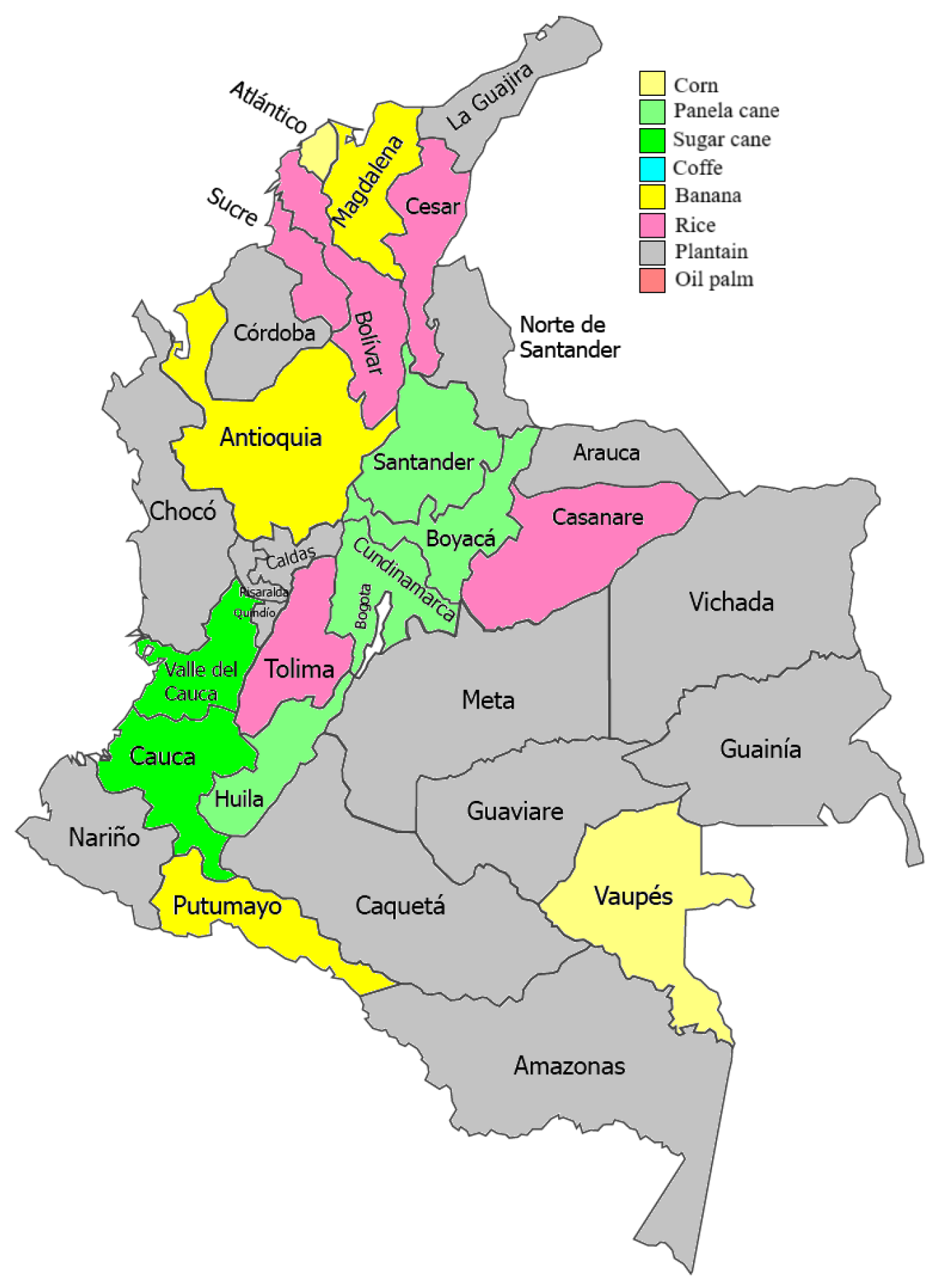 | Department | Oil Palm | Corn | Panela Cane | Sugar Cane | Coffee | Banana | Rice | Plantain | ||||||||
