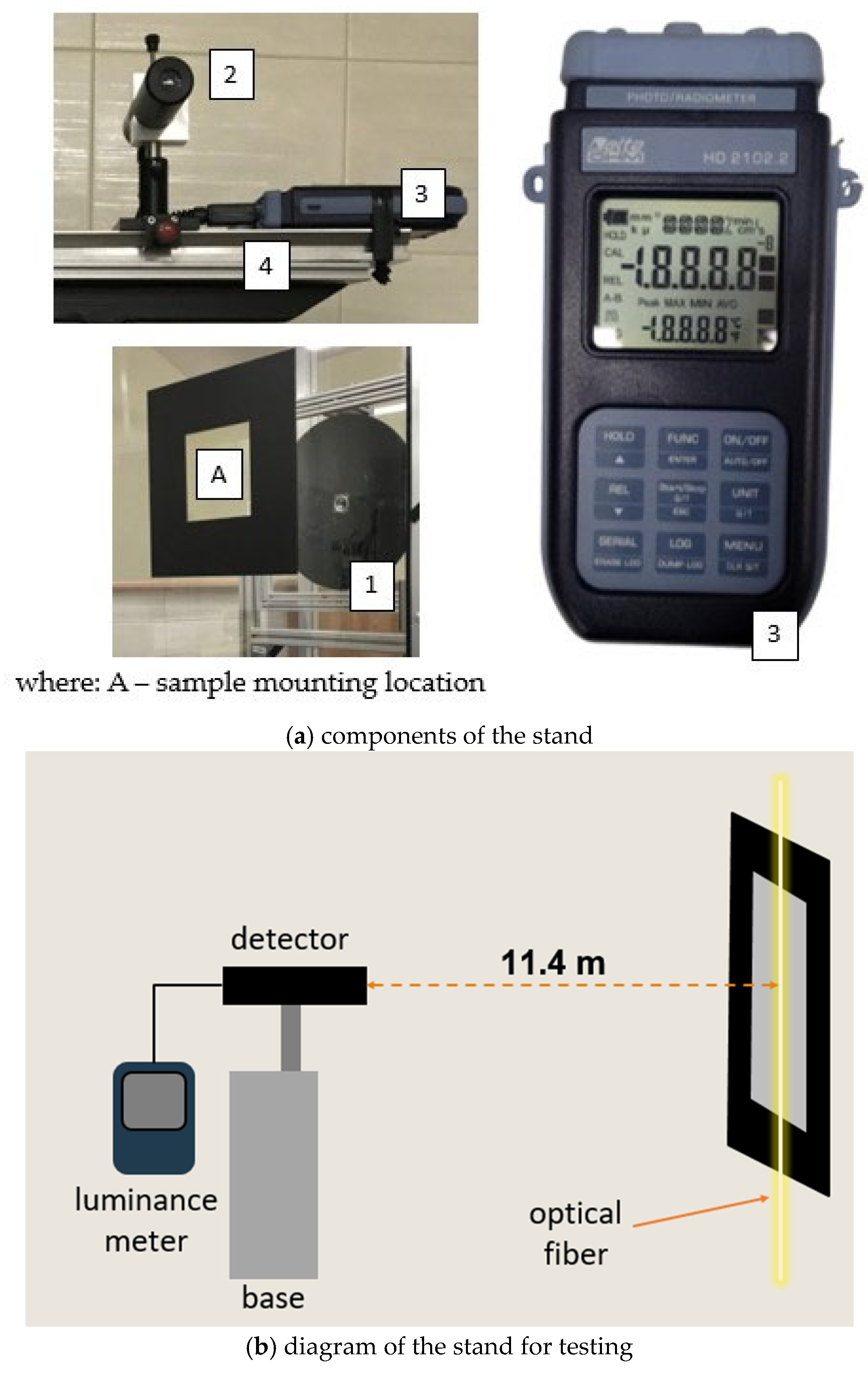 - A luminance meter (Delta OHM HD2102.1 photoradiometer—Senseca Germany GmbH, Remscheid, Germany) enabling luminance readings;