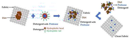 Since then, proteases have been extensively applied in detergent preparation, enhancing detergent efficiency, particularly in low-temperature washing, aligning with energy-saving and eco-friendly trends. Nearly 25–30% of the commercial enzymes are the key ingredients in detergent manufacturing [9]. The development of stabilised protease formulations ensures compatibility with several detergent components and conditions. Novozymes (Bagsværd, Denmark) is considered the largest and most dominant producer and supplier of proteases to the detergent industry due to its advanced technology, global market reach, and innovation in sustainable solutions.