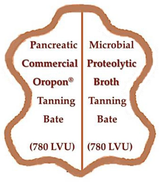 The test for application in the tanning process was performed by using the produced fermentation broth with 780 LVU (Löhlein–Volhard Unit) [40] of proteolytic activity on half-skin tanning, and using the commercial pancreatic bate Oropon® (BASF, Ludwigshafen am Rhein, Germany) [44] with the same LVU on the other half-skin tanning, both under the same tanning conditions of conventional tanning leather-making. The Löhlein–Volhard Unit (LVU) is a measure of proteolytic enzyme activity used in the leather industry, usually during the bating operation, a process that removes unwanted proteins and prepares the hide for tanning. One LVU represents the amount of enzyme needed to digest a specific amount of casein (1.725 mg) under standard conditions (pH 8.2 at 37 °C for one hour) [45].