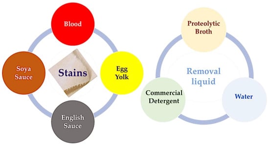 Proteinaceous stain removal from cotton fabric (squares of cotton fabric with the centre stained with egg yolk, blood, soya sauce, and English sauce) was assessed using the produced proteolytic broth and compared with the use of water (blank) or commercial detergent, under the same agitation (150 rpm) at room temperature (Figure 5). Identified cotton fabrics with a 5 cm side were used, on which a stain volume (100 µL) was impregnated and allowed to dry. The stained cotton was placed in different Petri dishes with the same volume (40 mL) of water as a blank, proteolytic broth, or commercial Presto® detergent (Unilever FIMA, Lisbon, Portugal) at 20% (mass of detergent per volume of water). The stain removal was visually observed, and stain removal time was determined in triplicate experiments and reported in minutes.