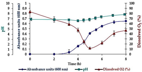 The fermentation pH and dissolved oxygen parameters assessed online and the absorbance at 600 nm (biomass) are presented in Figure 6. An almost 3 h lag phase, followed by an exponential growth phase from 3 to 7 h, and a stationary phase were observed in the absorbance over time analysis [56]. Dissolved oxygen decreased with growth, as expected. The fermentation monitoring revealed that extracellular proteolytic activity initiates simultaneously with a minimum dissolved oxygen of 10% at the end of the exponential growth phase, possibly due to secondary metabolism activation, in which cells, having depleted the more readily assimilable nutrients, start to break down the more complex substrates. The pH was maintained during the lag phase, decreased during the exponential phase, and slightly increased by the end of the exponential growth phase and the stationary phases.