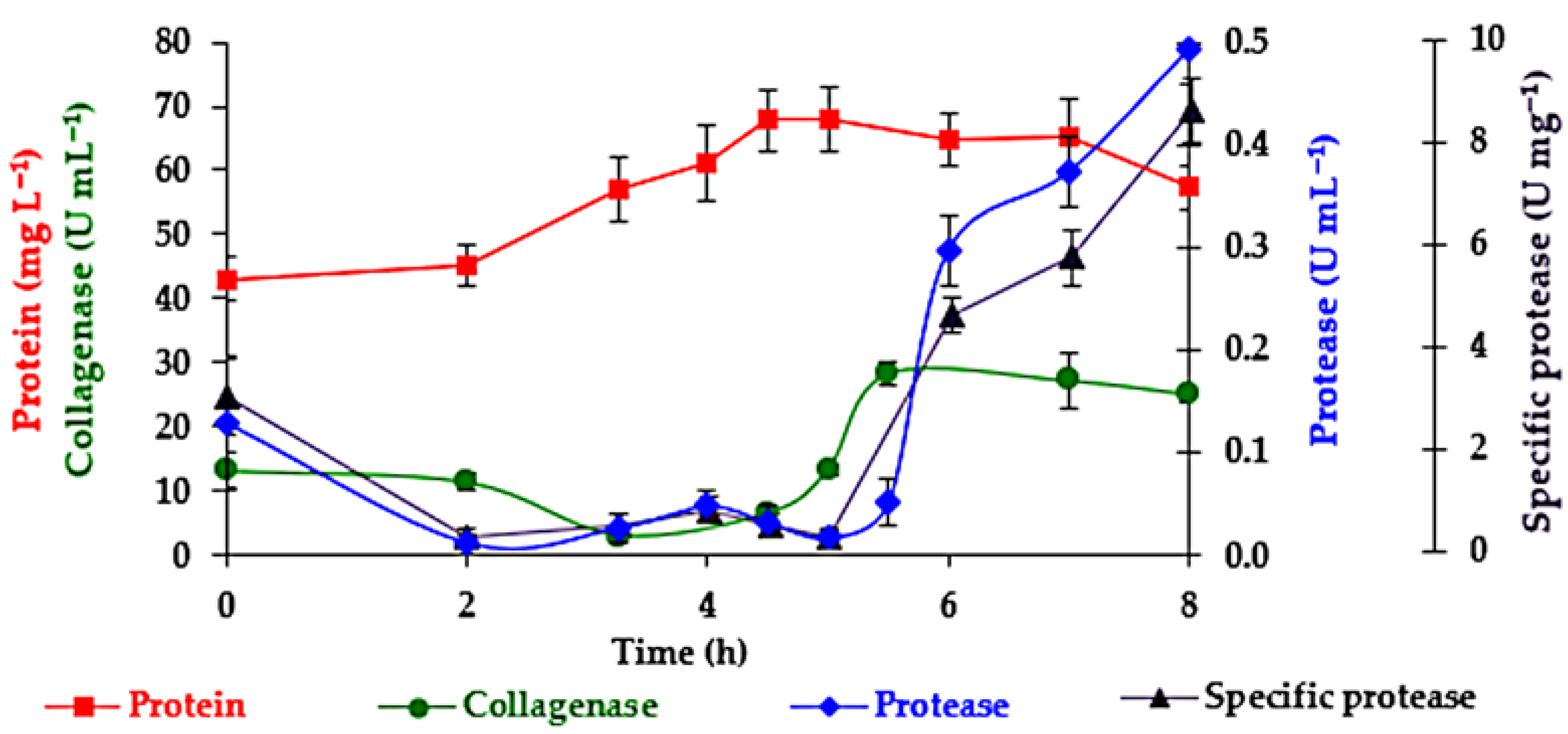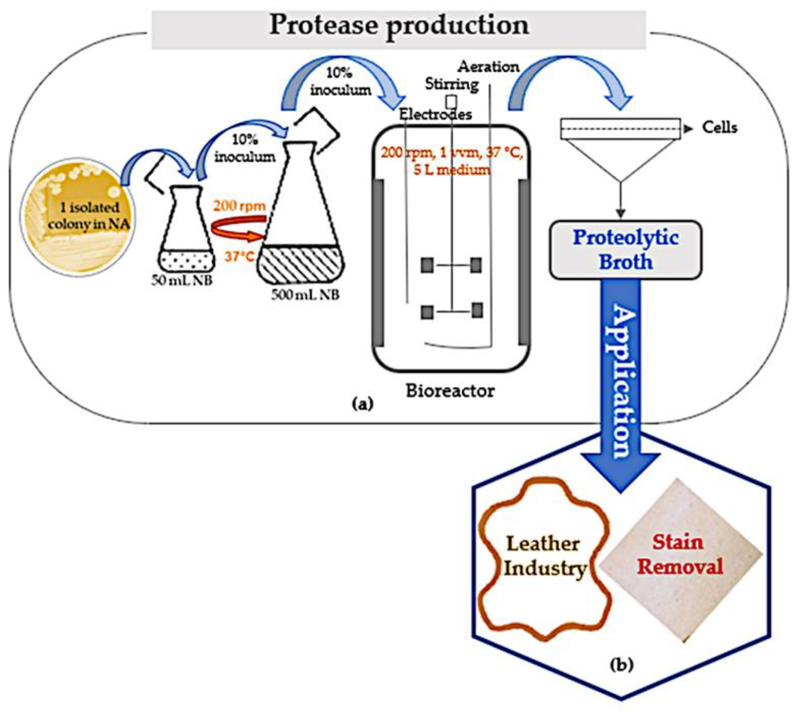 - Contesini, F.J.; Melo, R.R.d.; Sato, H.H. An Overview of Bacillus Proteases: From Production to Application. Crit. Rev. Biotechnol. 2018, 38, 321–334. [Google Scholar] [CrossRef]