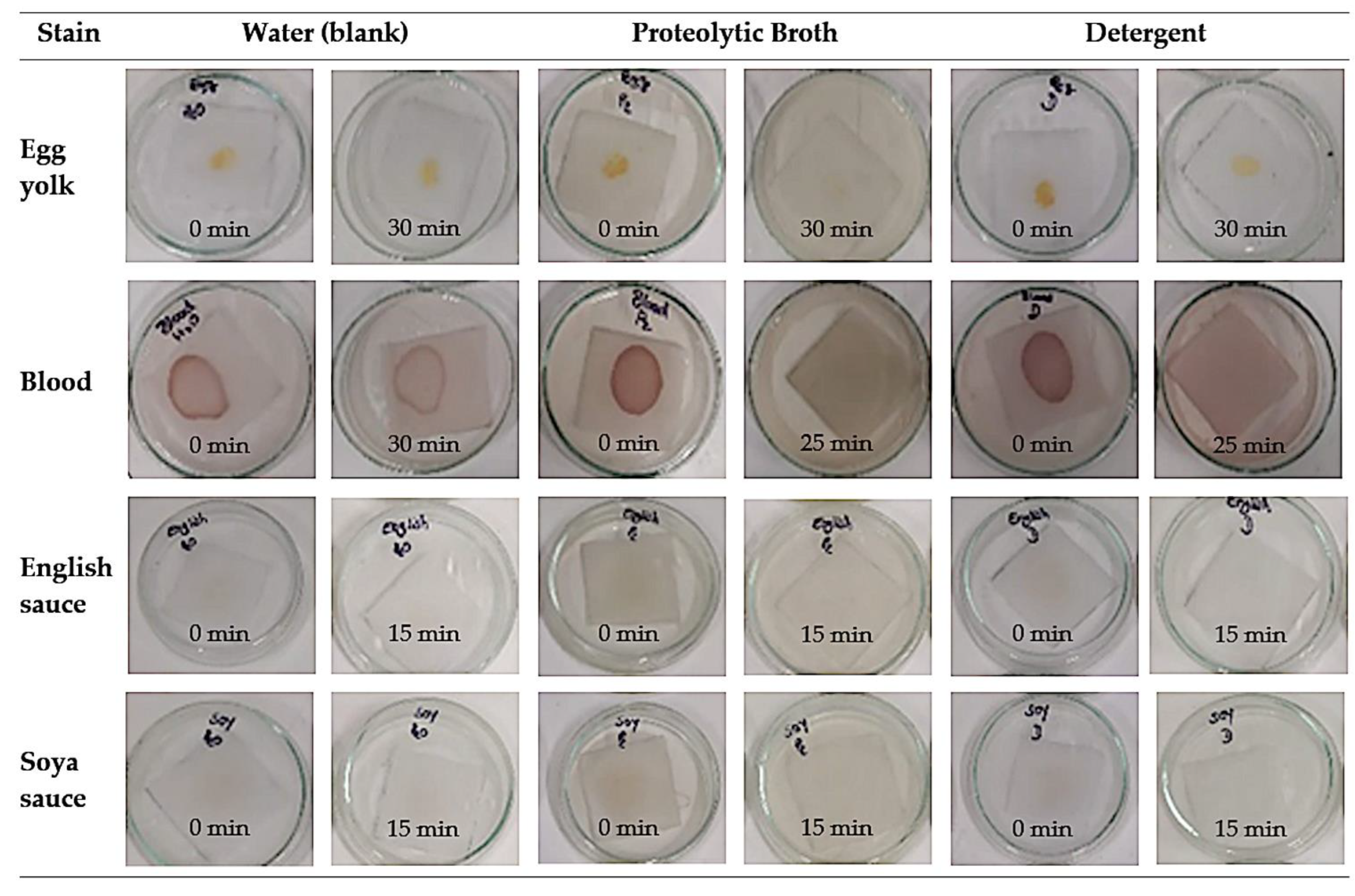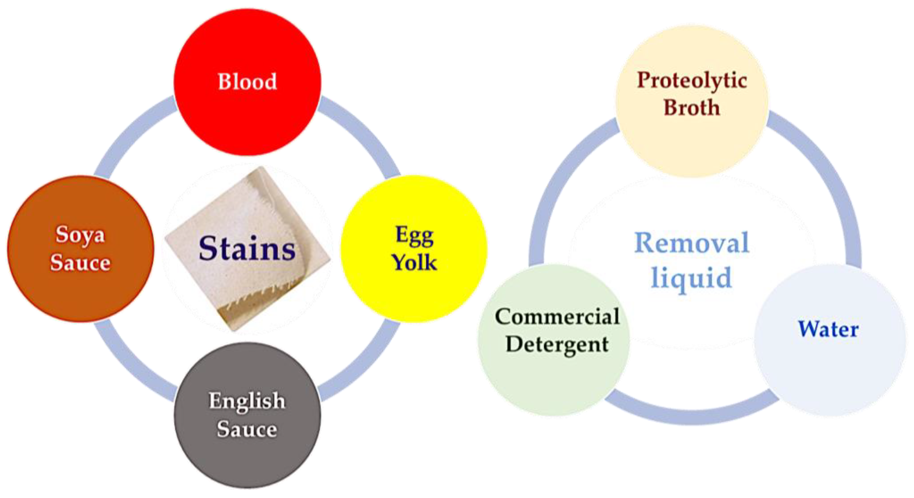 2.4.2. Proteolytic Broth Application in Stain Removal